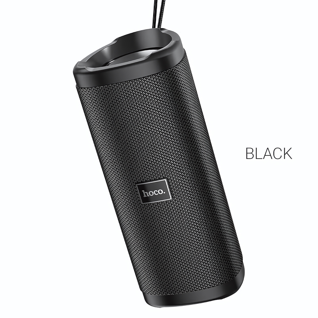 Колонка выполнена в черном цвете и имеет сетчатую поверхность, что придает ей современный вид. На верхней части колонки предусмотрен выступ для удобного крепления или переноски. Логотип бренда HOCO добавляет стильный акцент. Размеры колонки идеально подходят для использования в любых условиях, а шнур для подвешивания делает ее еще более удобной.