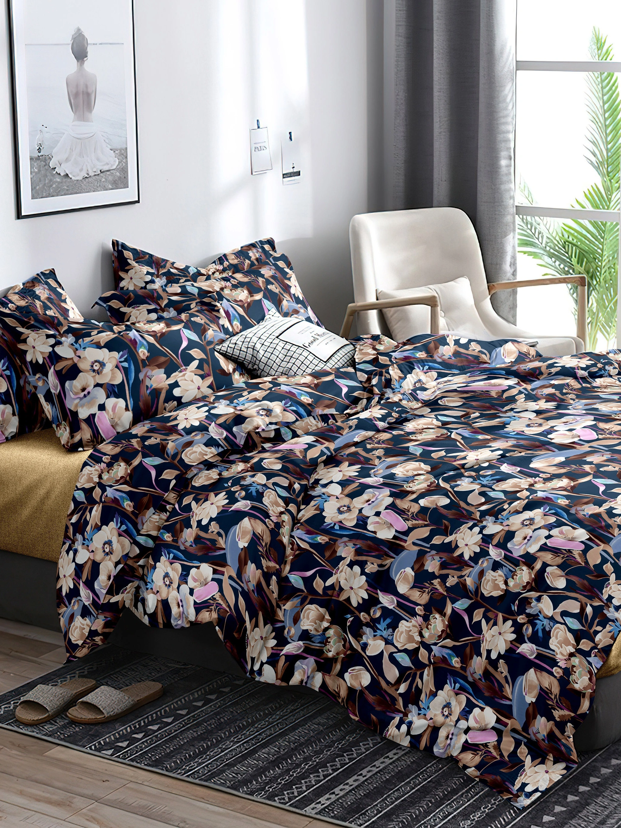 Преобразите интерьер своей спальни и обеспечьте себе комфортный отдых с комплектом постельного белья от российского бренда «Павлайн». Дизайн «Беж цветы на синем» — это гармоничное сочетание глубокого темно-синего фона и изысканного цветочного принта в бежевых, коричневых и лиловых тонах. Крупный узор из стилизованных листьев и цветов на гладкой ткани с легким блеском добавит комнате уюта и станет центральным акцентом вашего интерьера.