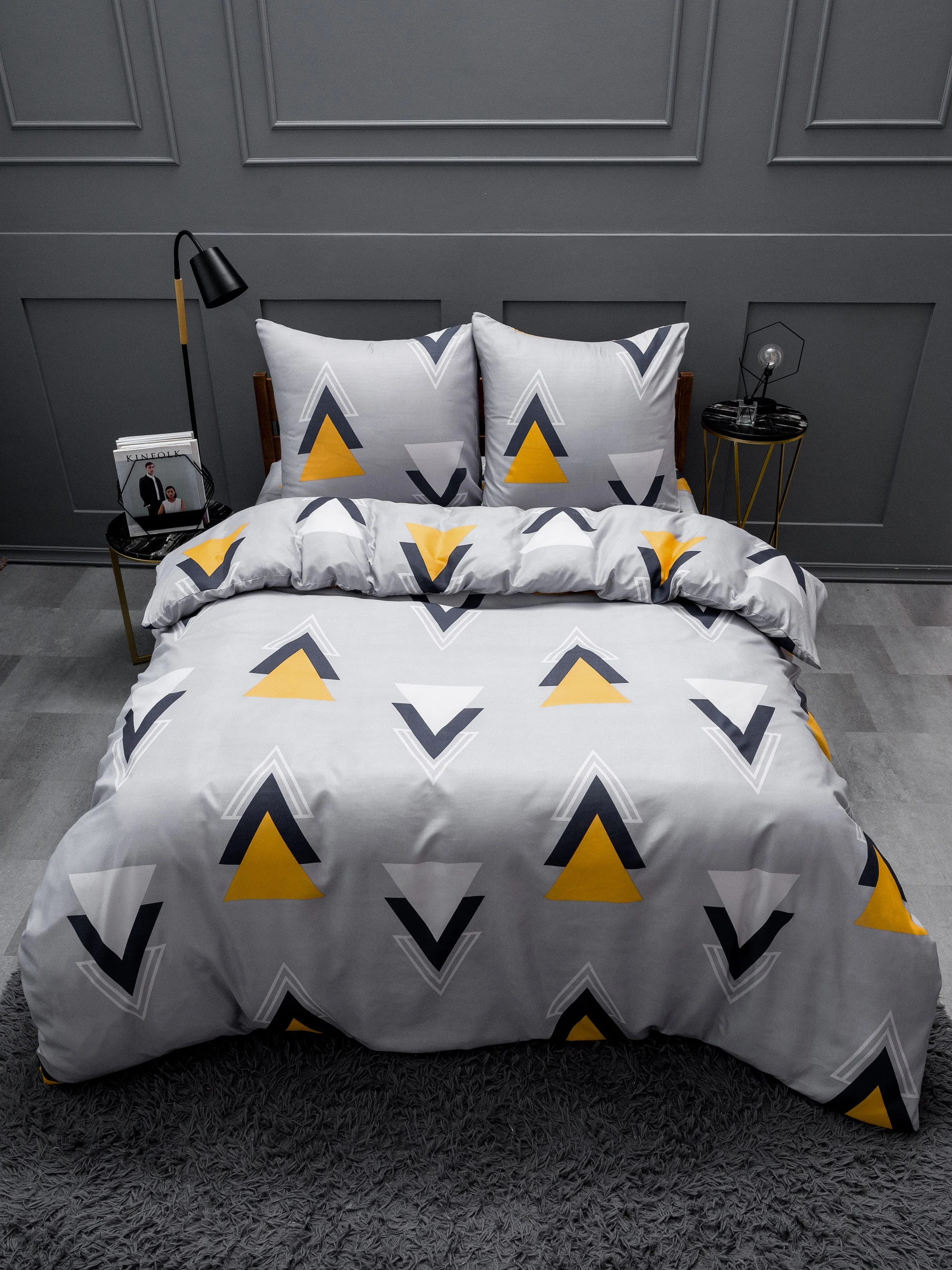 - Оригинальный дизайн: современный геометрический узор из треугольников и шевронов в шахматном порядке украшает светло-серое полотно.