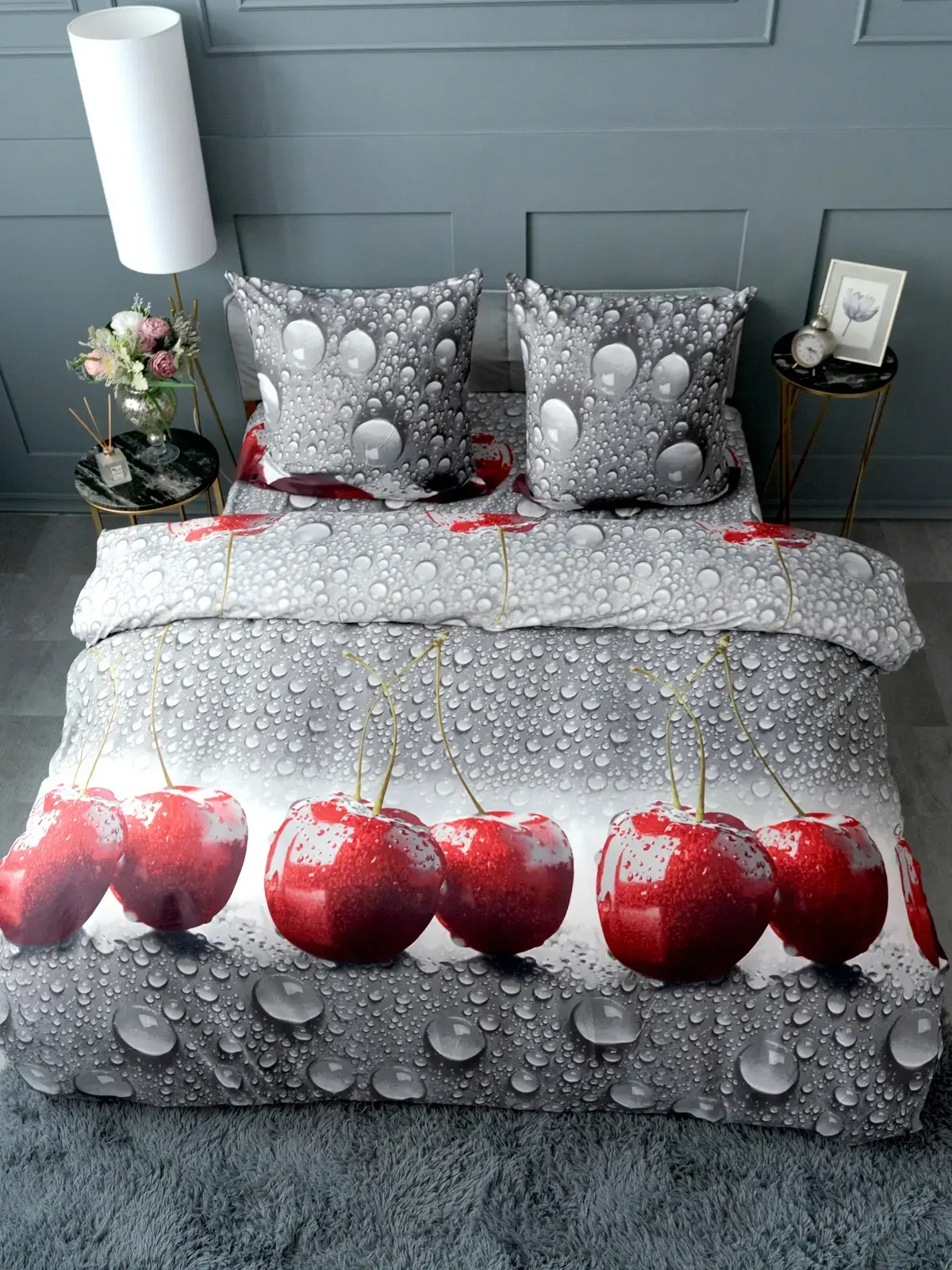 Постельное бельё из полисатина сочетает нежную текстуру хлопка и практичность современного материала. Рисунок со спелыми вишнями на фоне водных бликов создаёт атмосферу свежести в спальне.