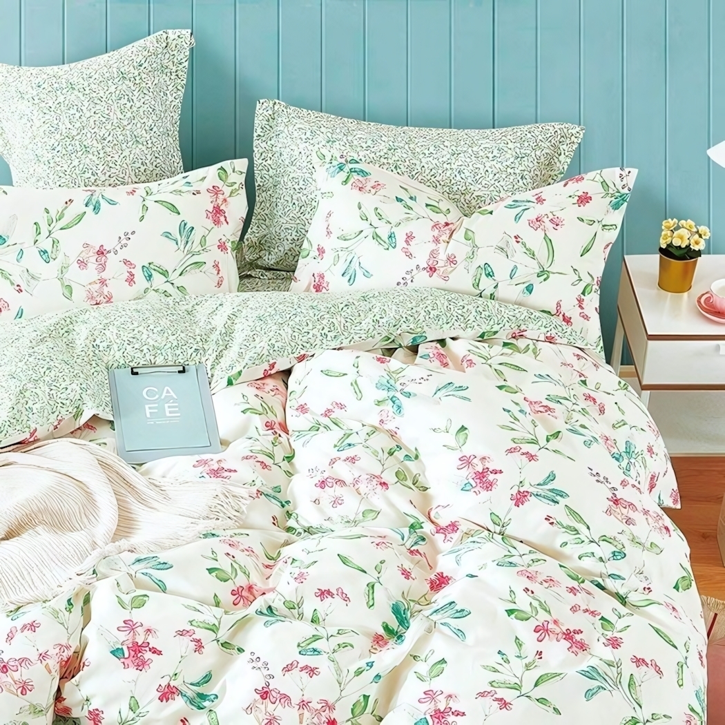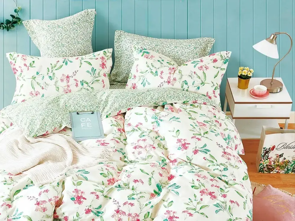 Комплект выполнен в светлых тонах с цветочным узором, что делает его универсальным для любого стиля интерьера. Размеры подушек и одеяла идеально подходят для стандартных односпальных кроватей. Плотность ткани обеспечивает долговечность и износостойкость, что гарантирует вам долгие годы использования.
