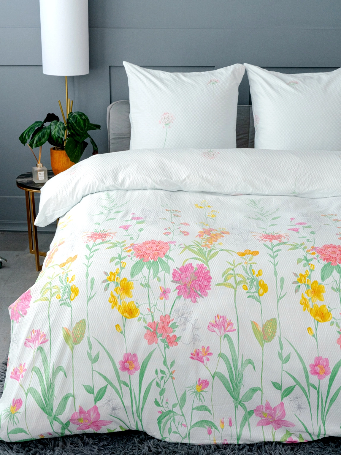 - Стильный дизайн: Разноцветный принт с цветами на белом фоне освежает интерьер любой спальни.