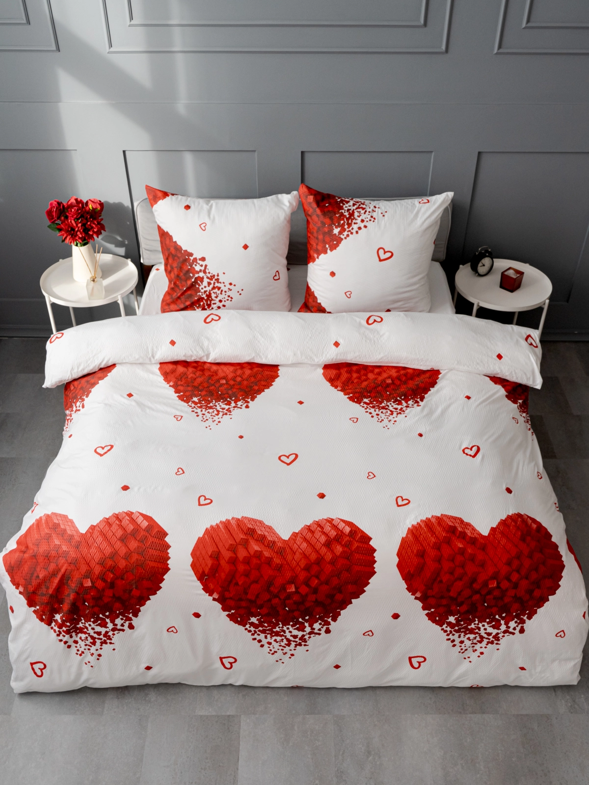Дизайн «Сердца кубики» на чистом белом фоне придает спальне современный и романтичный вид. Крупные красные сердца, словно собранные из множества мелких объемных кубиков с эффектом распада, выглядят необычно и приковывают взгляд. Такой принт станет ярким акцентом в интерьере и наполнит комнату уютом. Сочетание белого и красного цветов всегда остается актуальным и освежает пространство.