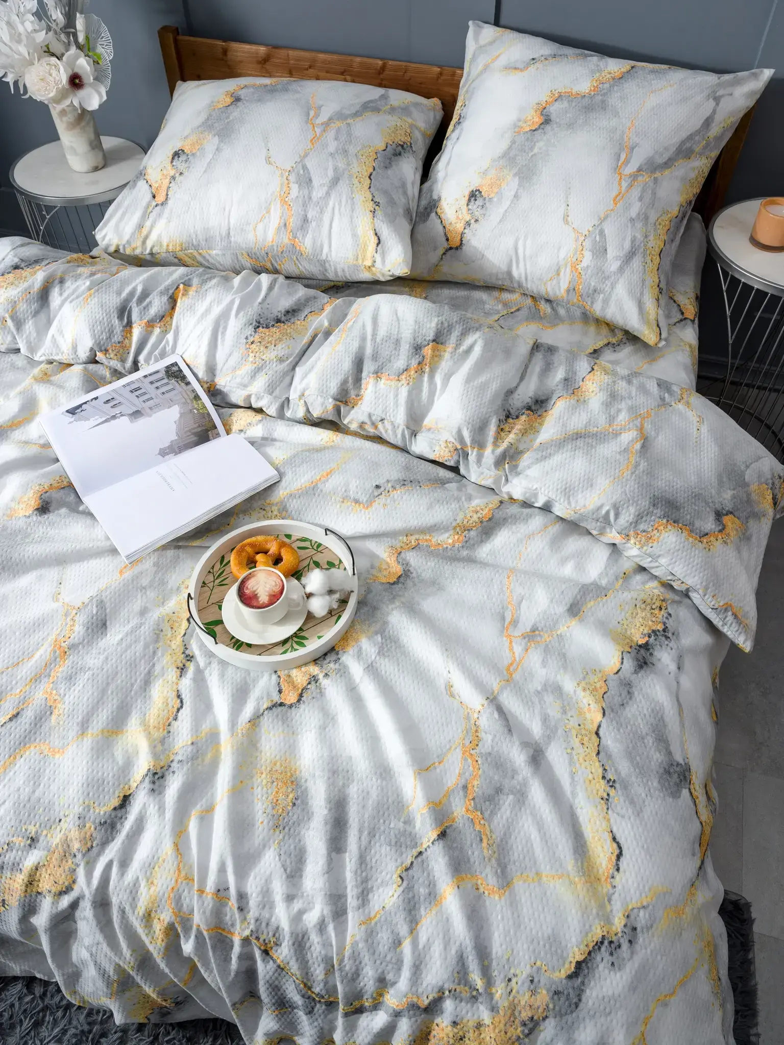 Превратите свою спальню в уголок роскоши с постельным бельем "Жанет Золотой мрамор". Элегантный дизайн с золотистыми узорами создает атмосферу изысканности и уюта.