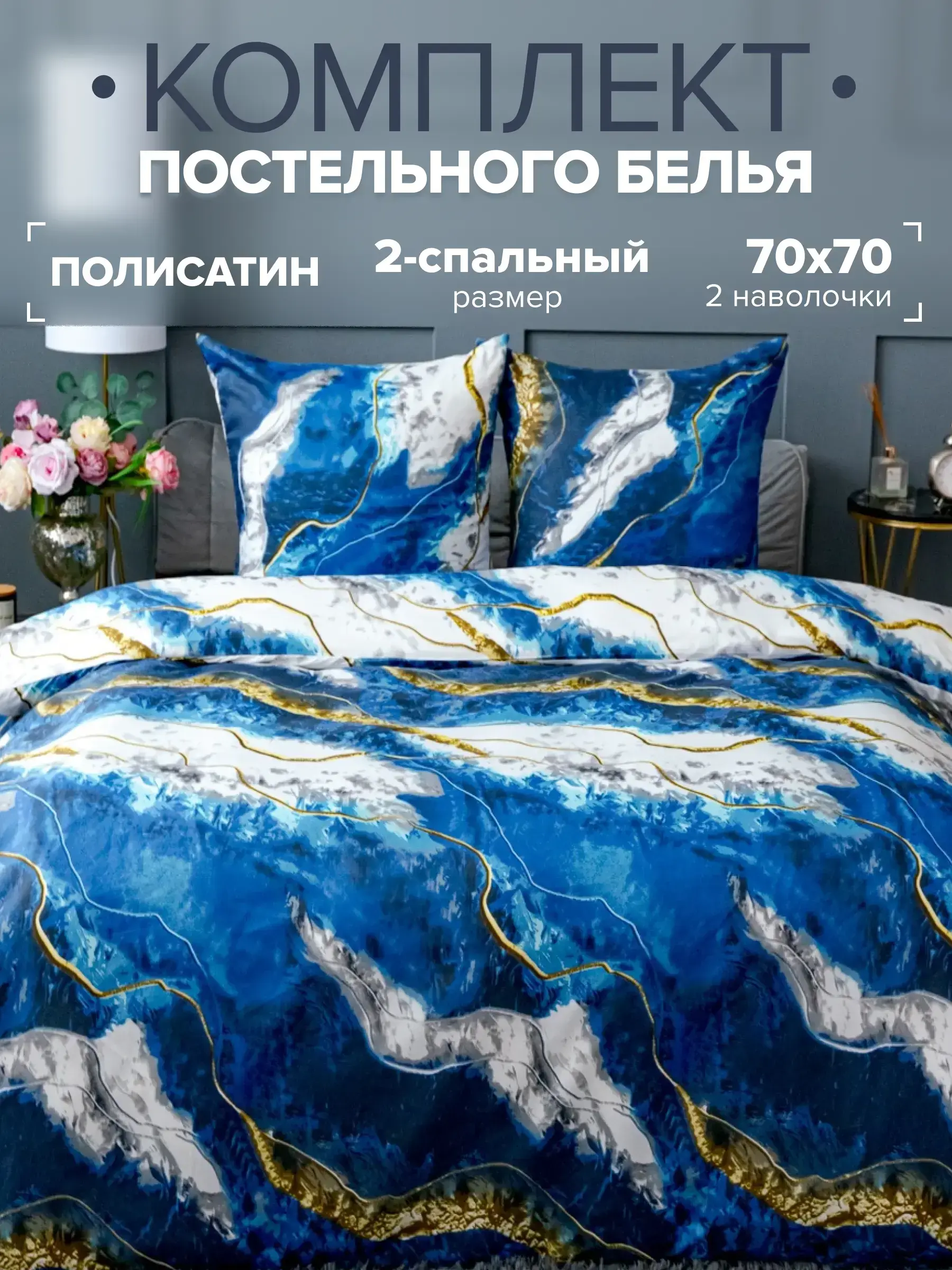Комплект постельного белья 2-спальный, полисатин, сине-голубой с волнами, мягкость и износостойкость