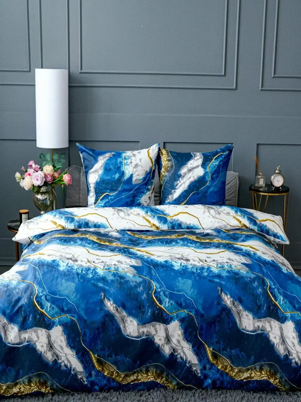 Комплект постельного белья из мягкого полисатина создан для тех, кто ценит качественный сон и эстетику домашнего текстиля. Абстрактный рисунок волн в сине-голубой гамме с золотистыми акцентами добавит стиля вашему интерьеру.
