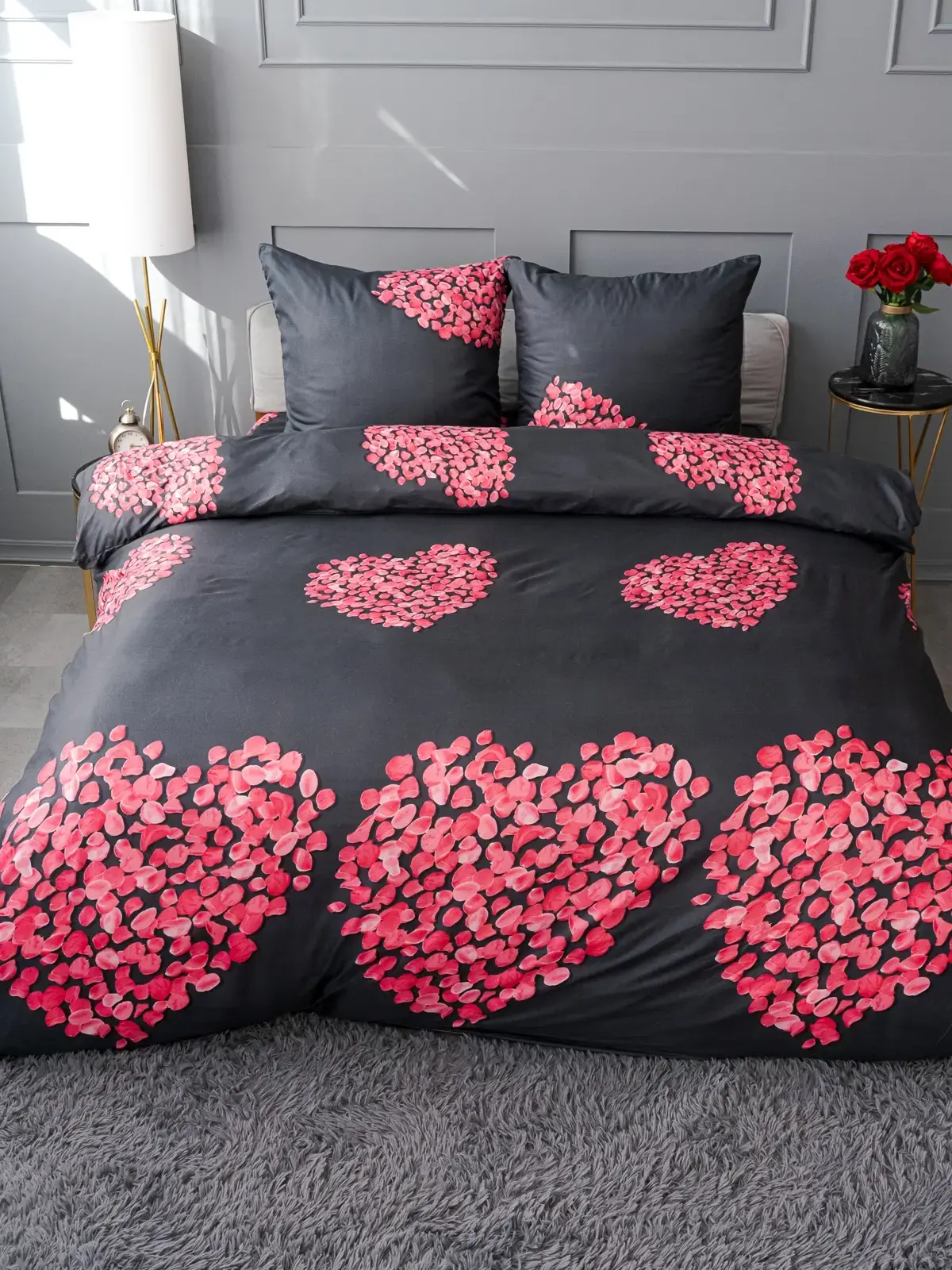 Темный фон с яркими розовыми сердцами создает эффектный контраст, который привлекает внимание и создает уютную атмосферу. Это белье станет отличным выбором для тех, кто ценит комфорт и стиль в своем доме.
