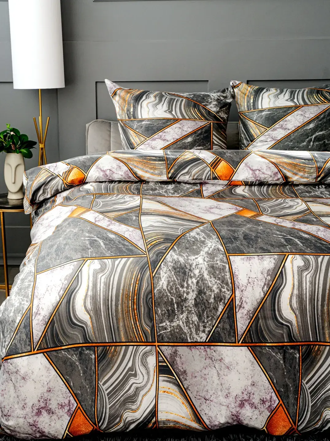 Цветовая гамма включает черный, белый, серый и золотистый, что позволяет легко сочетать белье с различными стилями интерьера. Постельное белье не только красиво выглядит, но и обеспечивает комфортный сон благодаря своей мягкости и приятной текстуре. Размеры пододеяльника и наволочек идеально подходят для стандартных спальных принадлежностей, что делает его универсальным выбором для любого дома.