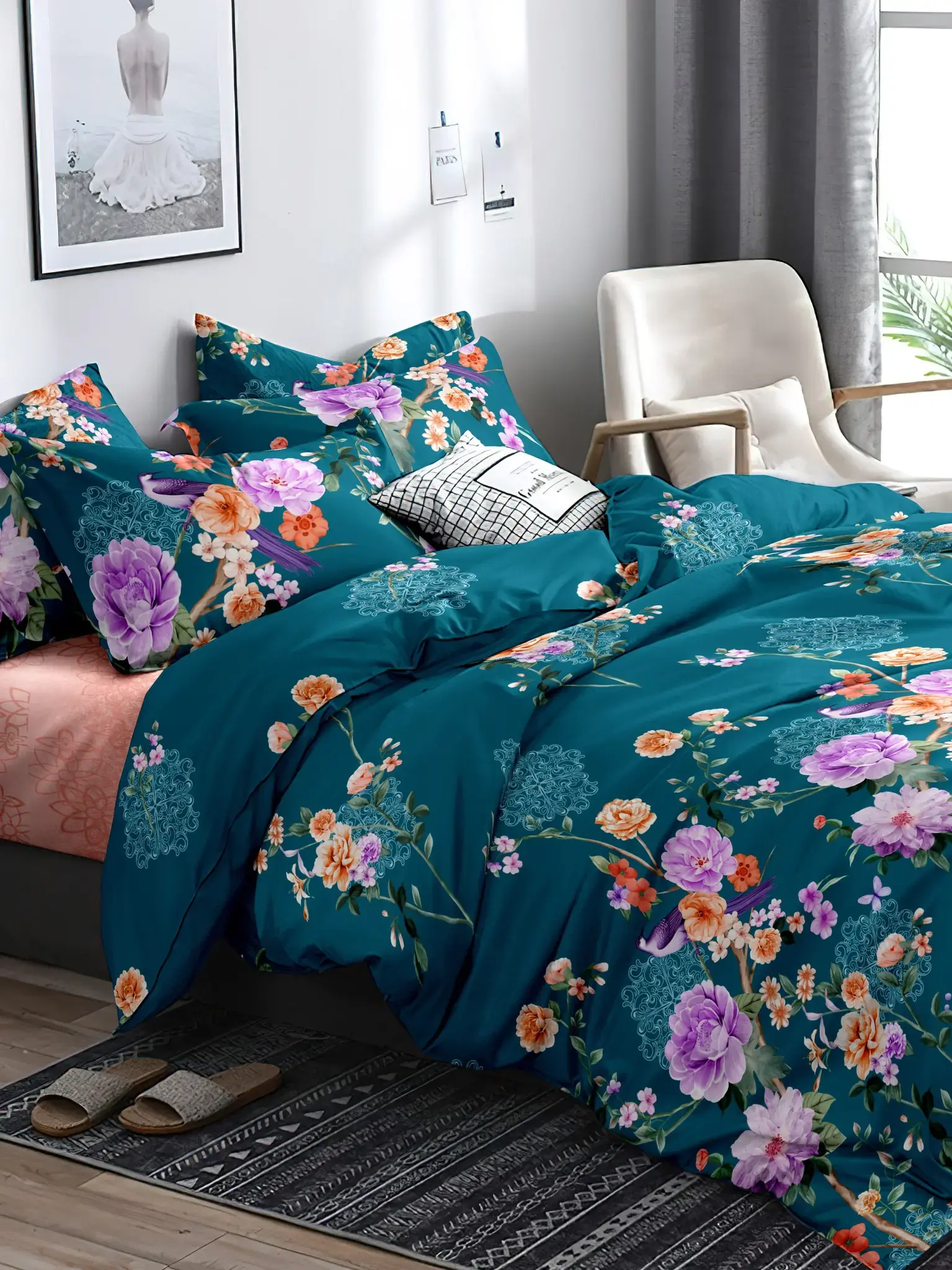 Комплектация 2.0 включает пододеяльник, простыню и две наволочки. Темно-зеленый фон с контрастными цветочными элементами создает выразительный акцент в интерьере. Материал сохраняет форму после стирки при температуре до 60°C.