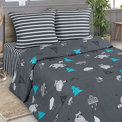 Комплект постельного белья 2,0сп 'Еноты', поплин, 100% хлопок, серый/голубой