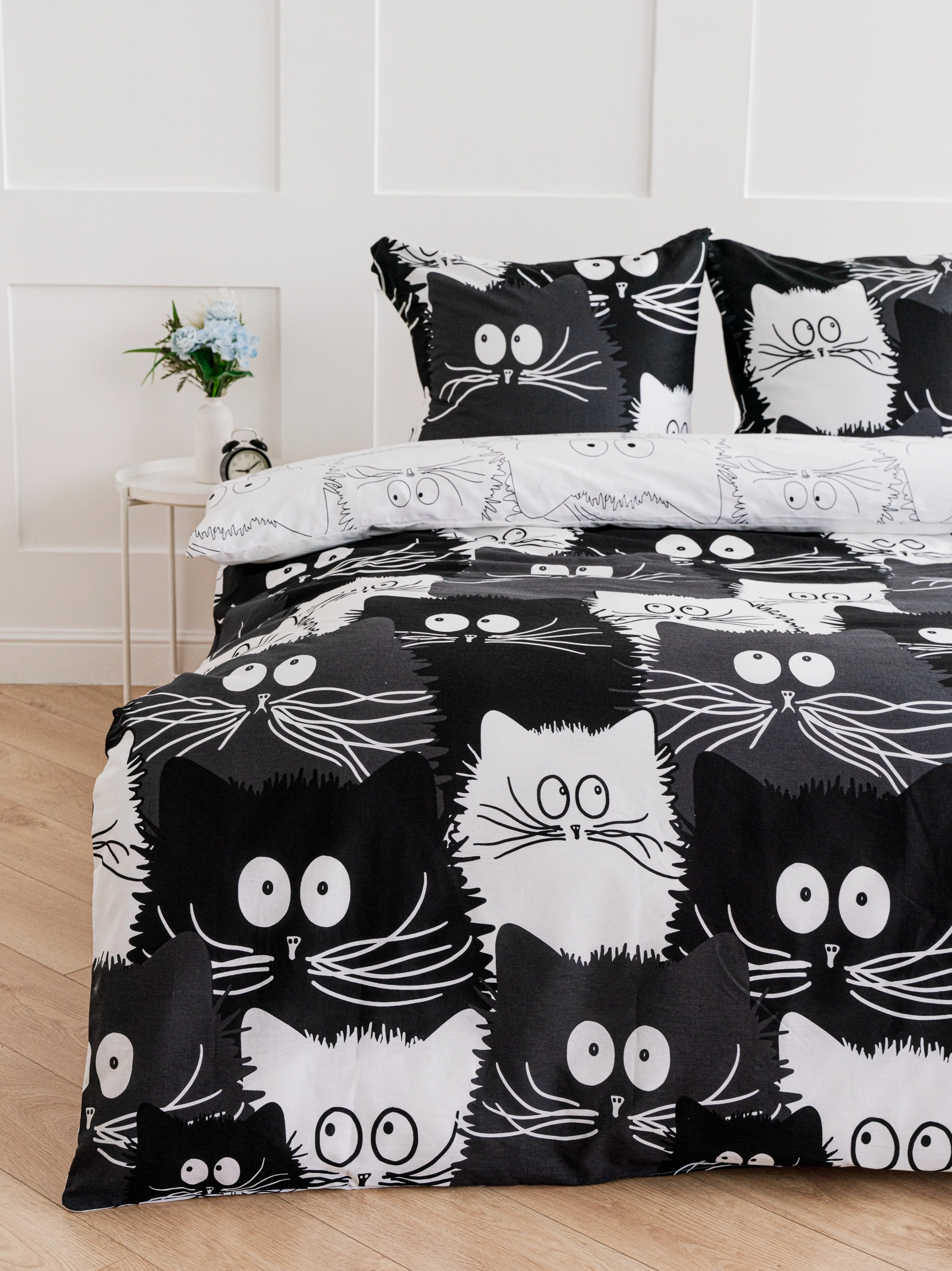 Погрузитесь в атмосферу безупречного комфорта с комплектом постельного белья PAVLine из коллекции «Коты Компания». Оригинальный черно-белый принт с очаровательными мультяшными котами мгновенно преобразит интерьер вашей спальни, добавив в него нотки индивидуальности и уюта. Этот комплект создан для тех, кто ценит качественный сон и эстетичный внешний вид домашнего текстиля.