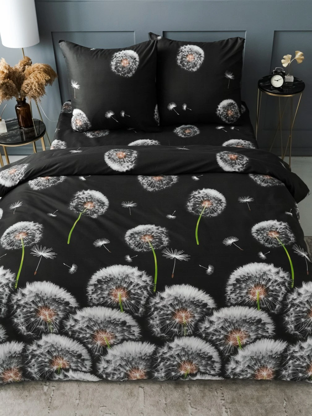 Комплект постельного белья «Павлайн» с принтом «Одуванчики» станет стильным акцентом в вашей спальне. Глубокий черный фон в сочетании с нежным цветочным узором создает эффектный контраст, который добавит интерьеру элегантности и современности.