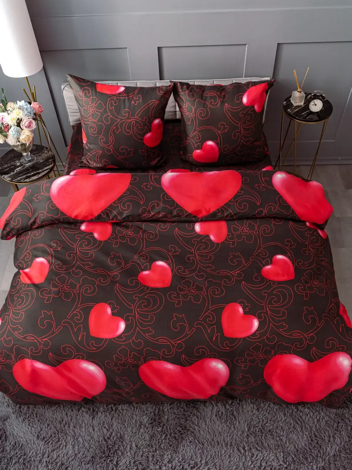 Погрузитесь в атмосферу уюта с комплектом постельного белья из износостойкого полисатина. Контрастный дизайн с алыми сердцами на глубоком черном фоне добавит стиля в интерьер вашей спальни.
