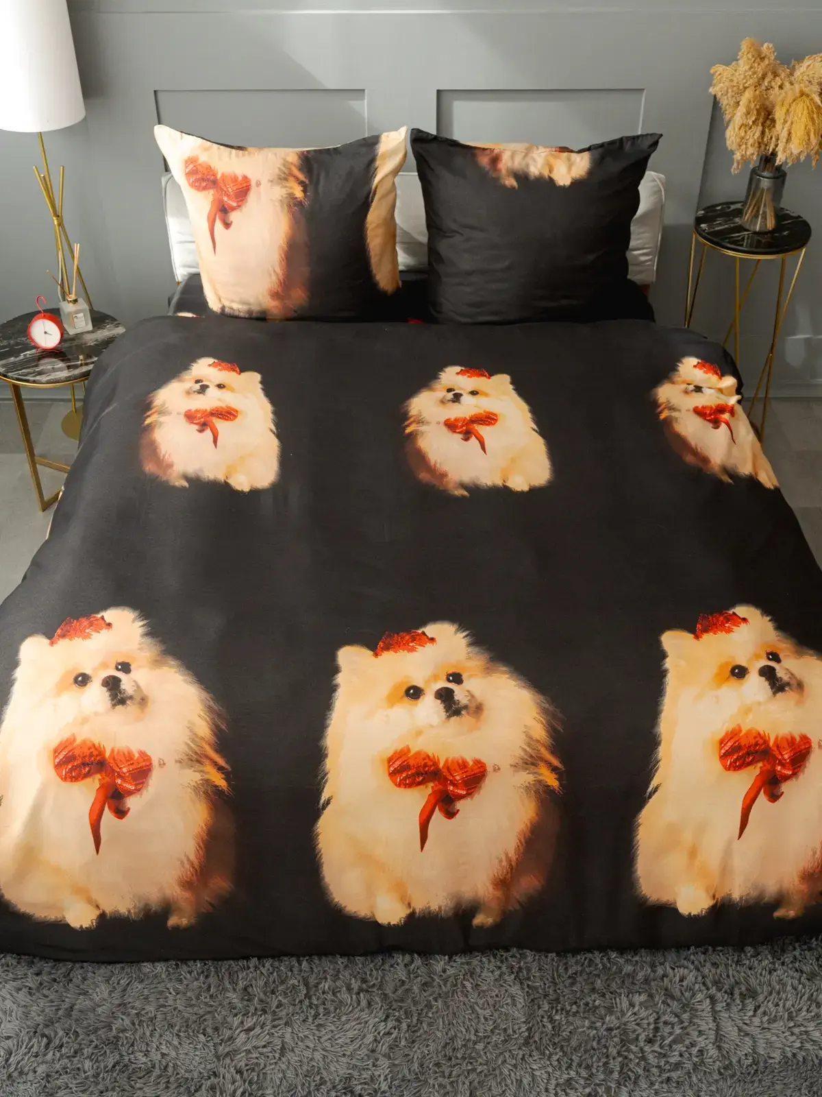 Цвет постельного белья черный, на котором изображены светло-коричневые и белые собаки с красными бантиками. Комплект включает в себя пододеяльник, простыню и наволочки, что делает его полноценным решением для вашей спальни. Размеры товара соответствуют стандартам евро, что позволяет легко использовать его с различными матрасами.