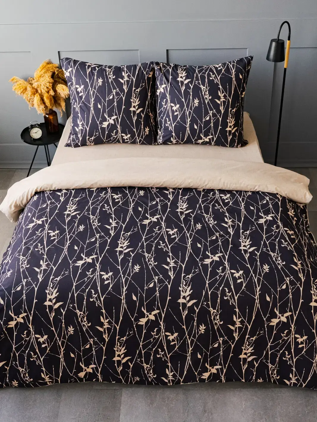 Утонченный рисунок "Золотые ветви" станет изысканным акцентом в любом интерьере спальни. Темно-синий фон с белым растительным орнаментом создает элегантную композицию.