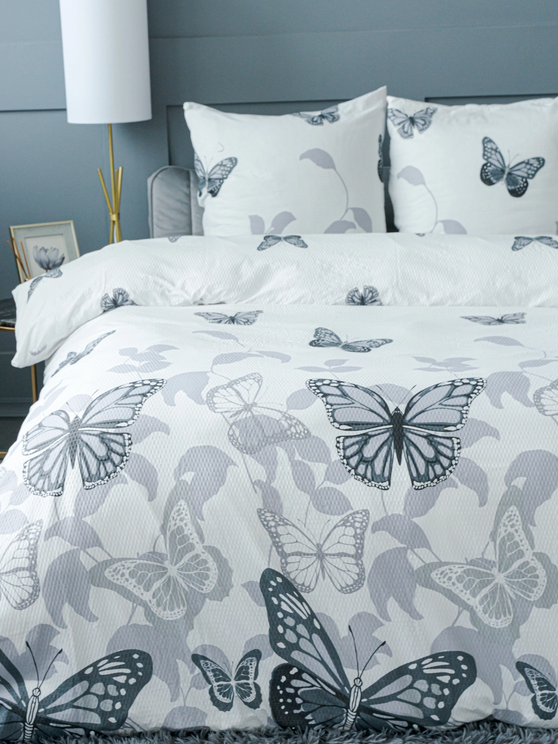 Создайте атмосферу нежности и спокойствия в своей спальне с комплектом постельного белья «Жанет». Изящный белый фон, украшенный графичным рисунком бабочек и силуэтов листьев в серых тонах, станет стильным акцентом вашего интерьера. Рельефная мелкоячеистая фактура ткани добавляет текстуру и тактильное удовольствие, делая отдых по-настоящему комфортным.