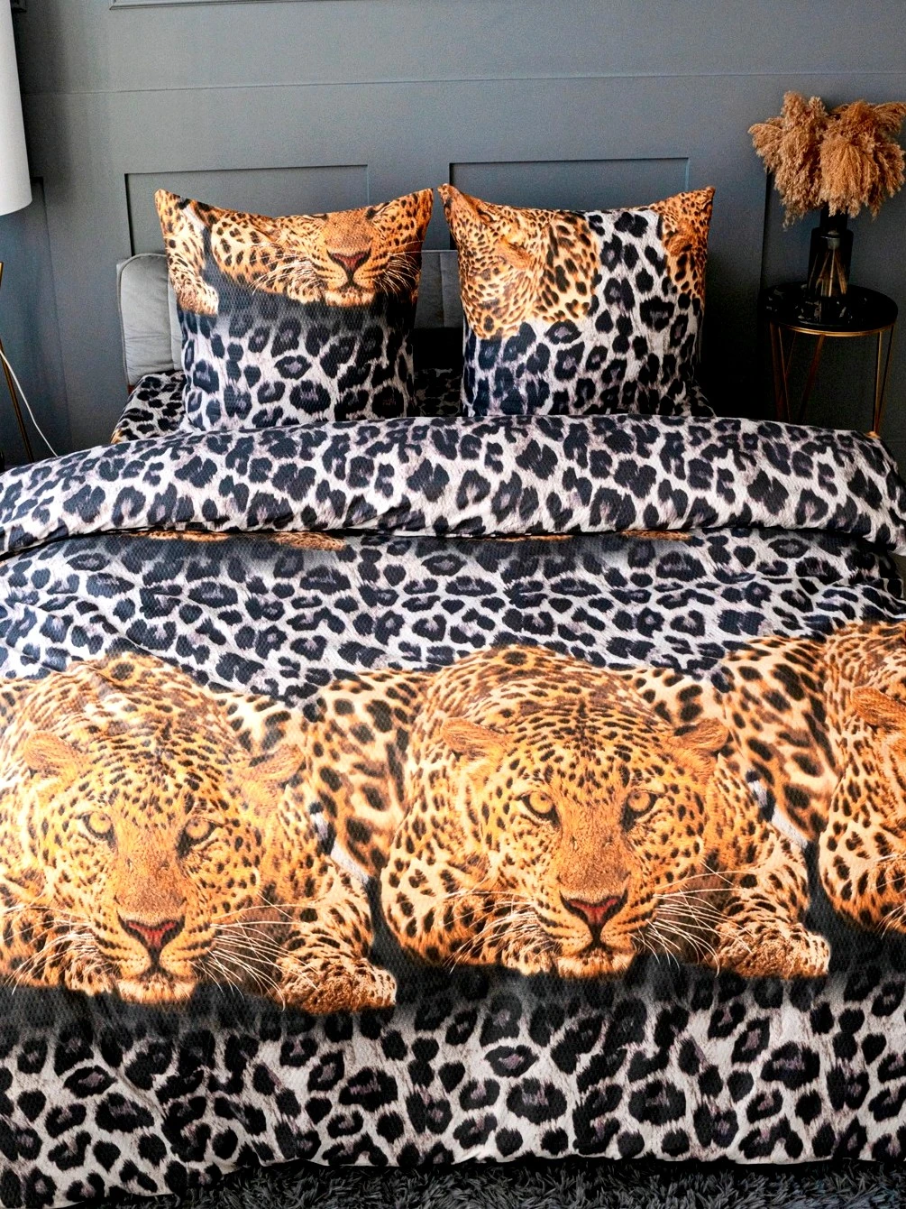- Эксклюзивный дизайн: Уникальный принт, имитирующий благородный окрас леопарда, создает эффектный акцент в интерьере. Композиция включает как общий пятнистый узор, так и художественное изображение животных, что делает комплект особенно выразительным.