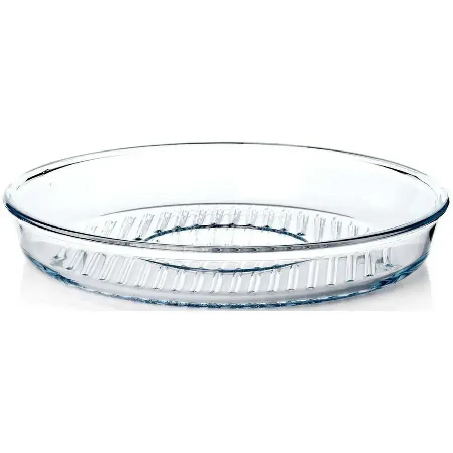 Изделие выполнено из качественного прозрачного стекла. Круглая форма с гладкой поверхностью, рельефные вертикальные полосы на дне и боковых стенках делают внешний вид уникальным и удобным для захвата. Бортики средней высоты позволяют использовать форму для различных типов блюд – от запеканок до десертов. Легко моется вручную и в посудомоечной машине.