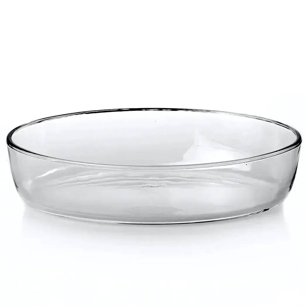 Размер формы — 353,5х247,5 мм. Материал — прозрачное стекло, устойчивое к перепадам температур. Овальная форма легко помещается в стандартных микроволновых печах и духовых шкафах. Подходит для сервировки — вы можете сразу подавать блюда на стол, экономя время на перекладывание.