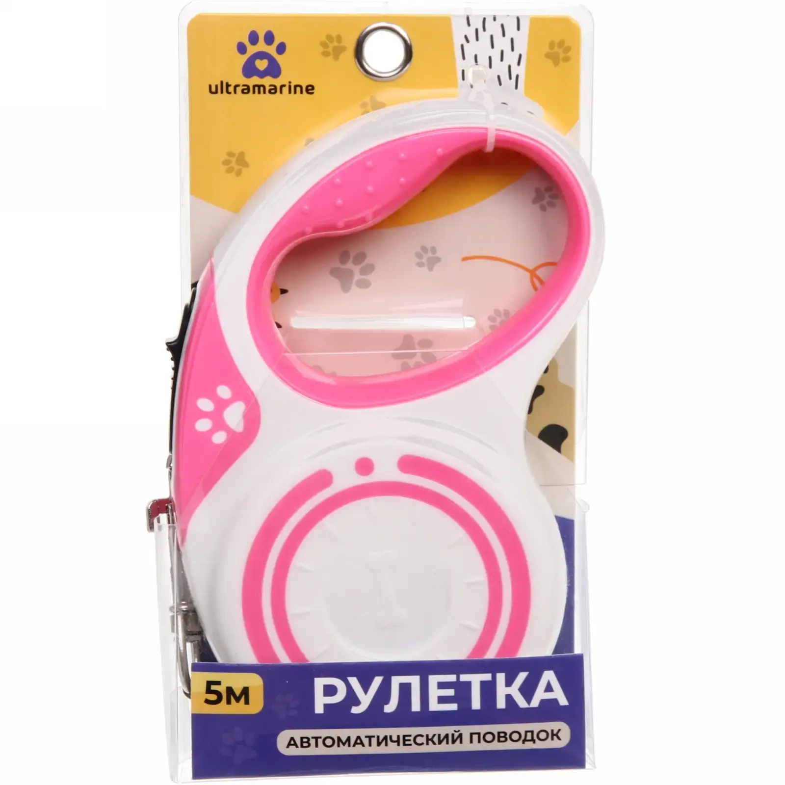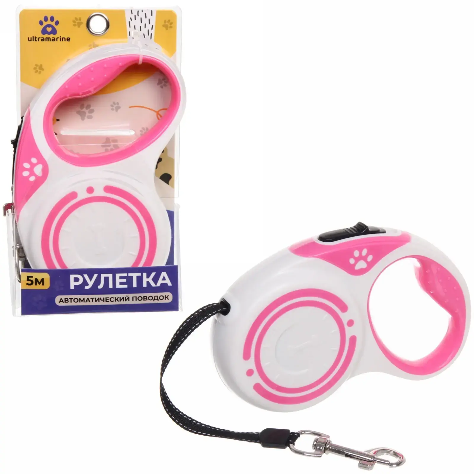 Поводок-рулетка «ЛАППИ» для собак до 15 кг, 5 м, белый с розовым, ударопрочный пластик, автоматическая фиксация
