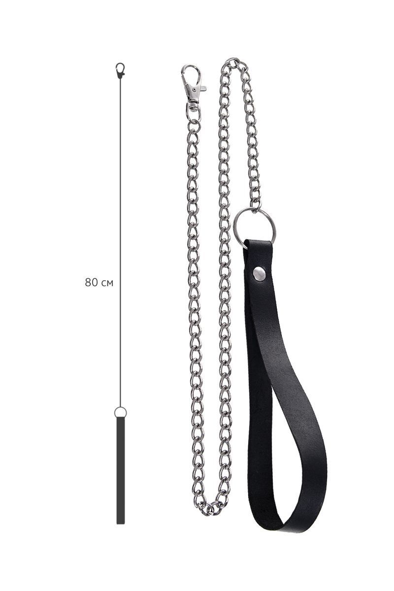Поводок выполнен из прочного металла и натуральной кожи, что обеспечивает его долговечность. Длина поводка составляет 80 см, что позволяет удобно управлять и контролировать. Черная кожаная ручка с гладкой текстурой обеспечивает комфортный захват, а карабин на конце цепи позволяет легко прикреплять поводок к другим аксессуарам.