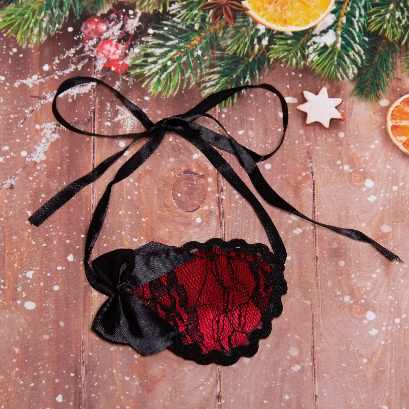 Повязка выполнена из текстиля, что делает ее приятной на ощупь и долговечной. Основной цвет — красный с черной кружевной отделкой, что создает эффектный контраст. Размеры не указаны, но повязка имеет стандартную форму, подходящую для большинства пользователей. Праздничная упаковка с надписью «С Новым годом!» делает этот аксессуар отличным подарком для друзей и близких.
