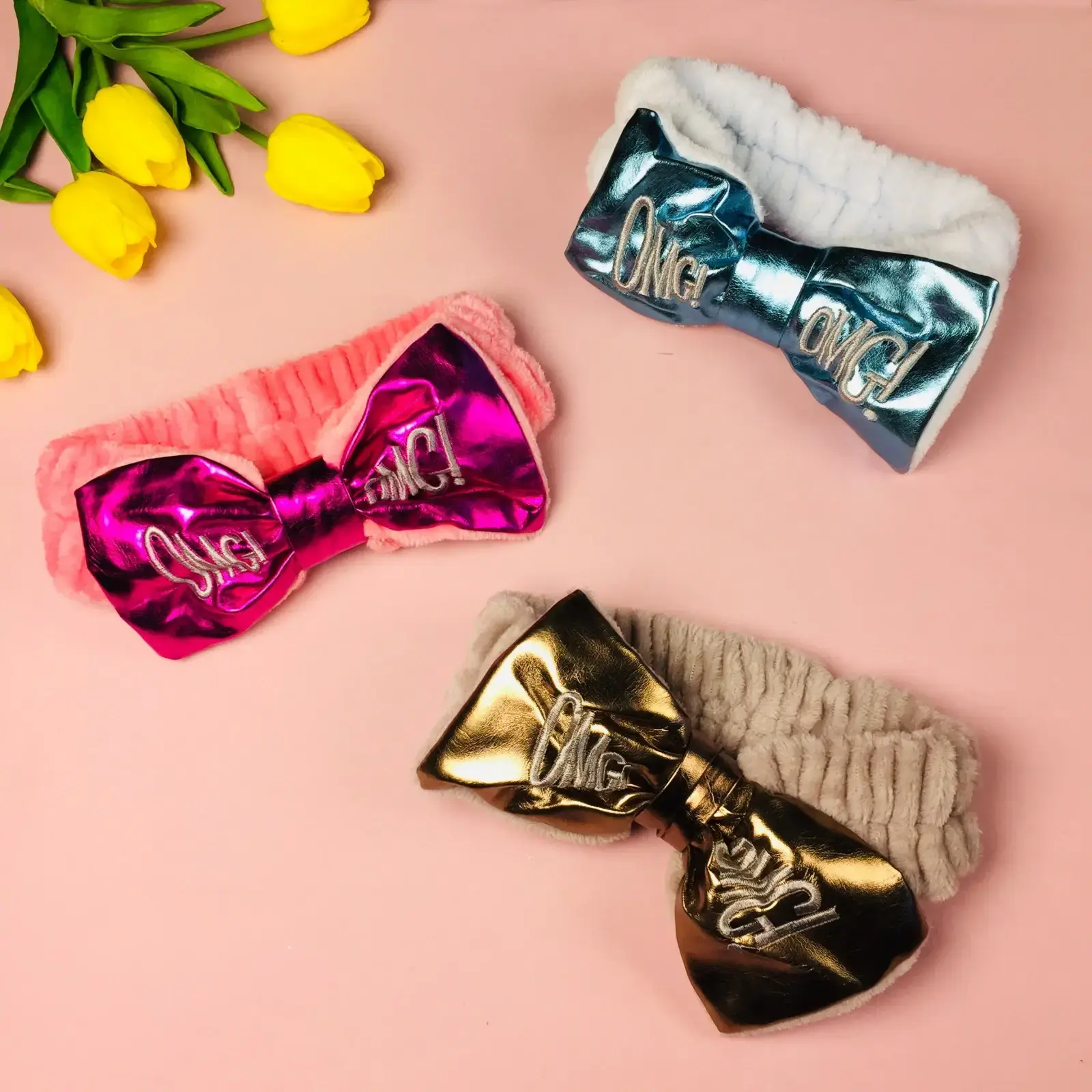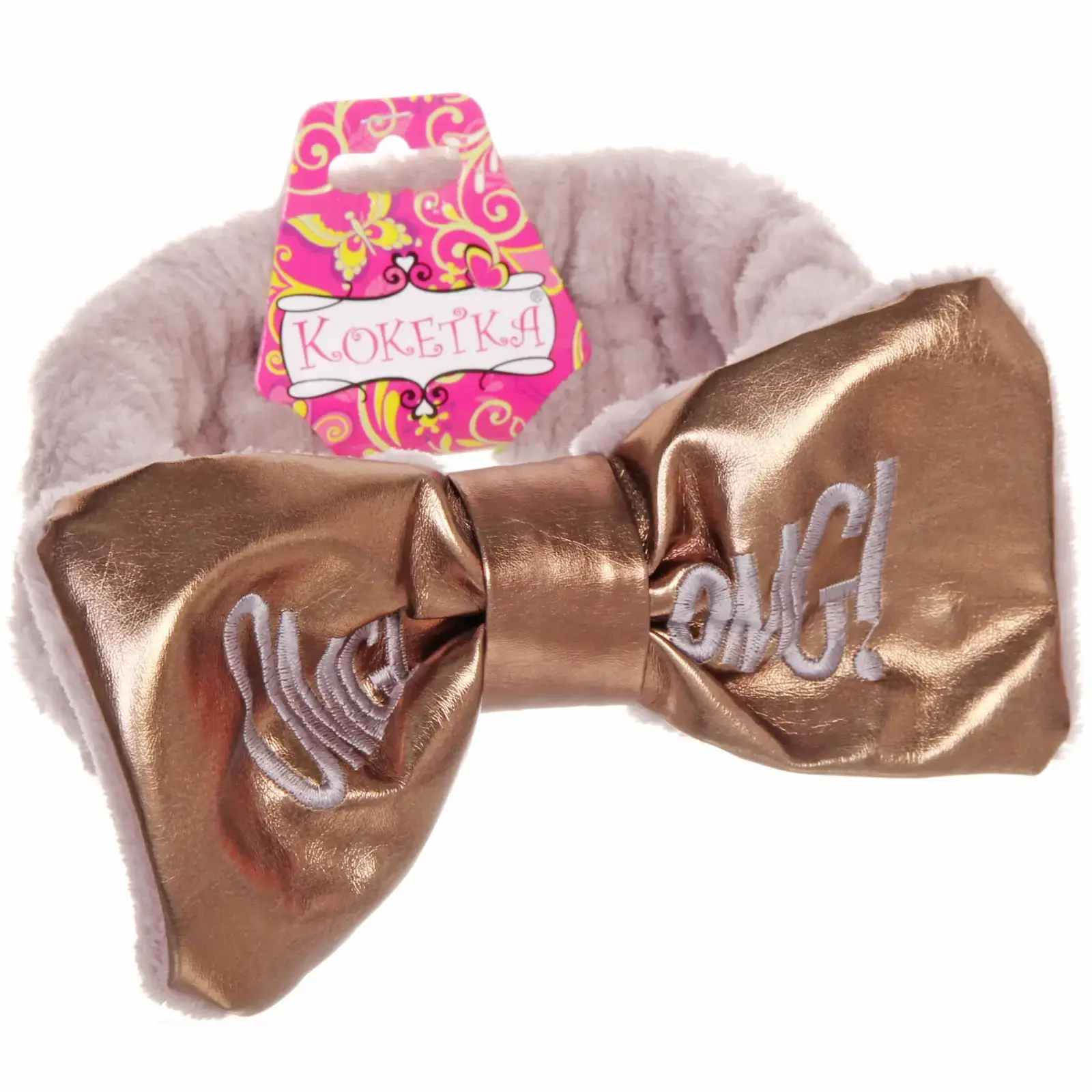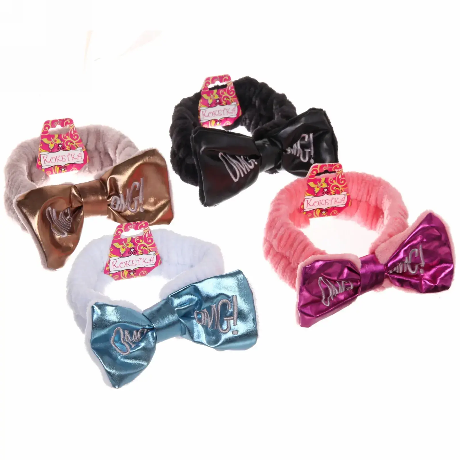 Повязка представлена в четырех модных оттенках: классический черный, нежно-розовый, спокойный бежевый и свежий голубой. Каждая модель украшена крупным бантом с фирменной надписью 'OMG!', создающей игривое настроение.