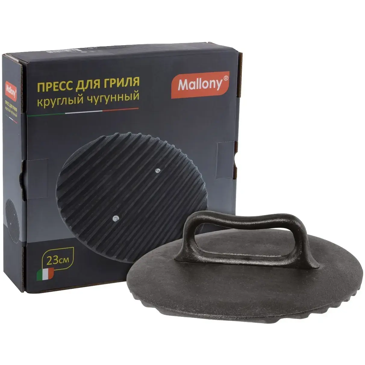 Пресс имеет диаметр 23 см и выполнен из качественного чугуна, что гарантирует его долговечность. Черный цвет и рифленая текстура делают его не только функциональным, но и стильным аксессуаром для вашей кухни. Не упустите возможность сделать ваши блюда еще более вкусными и аппетитными с помощью этого пресса для гриля!