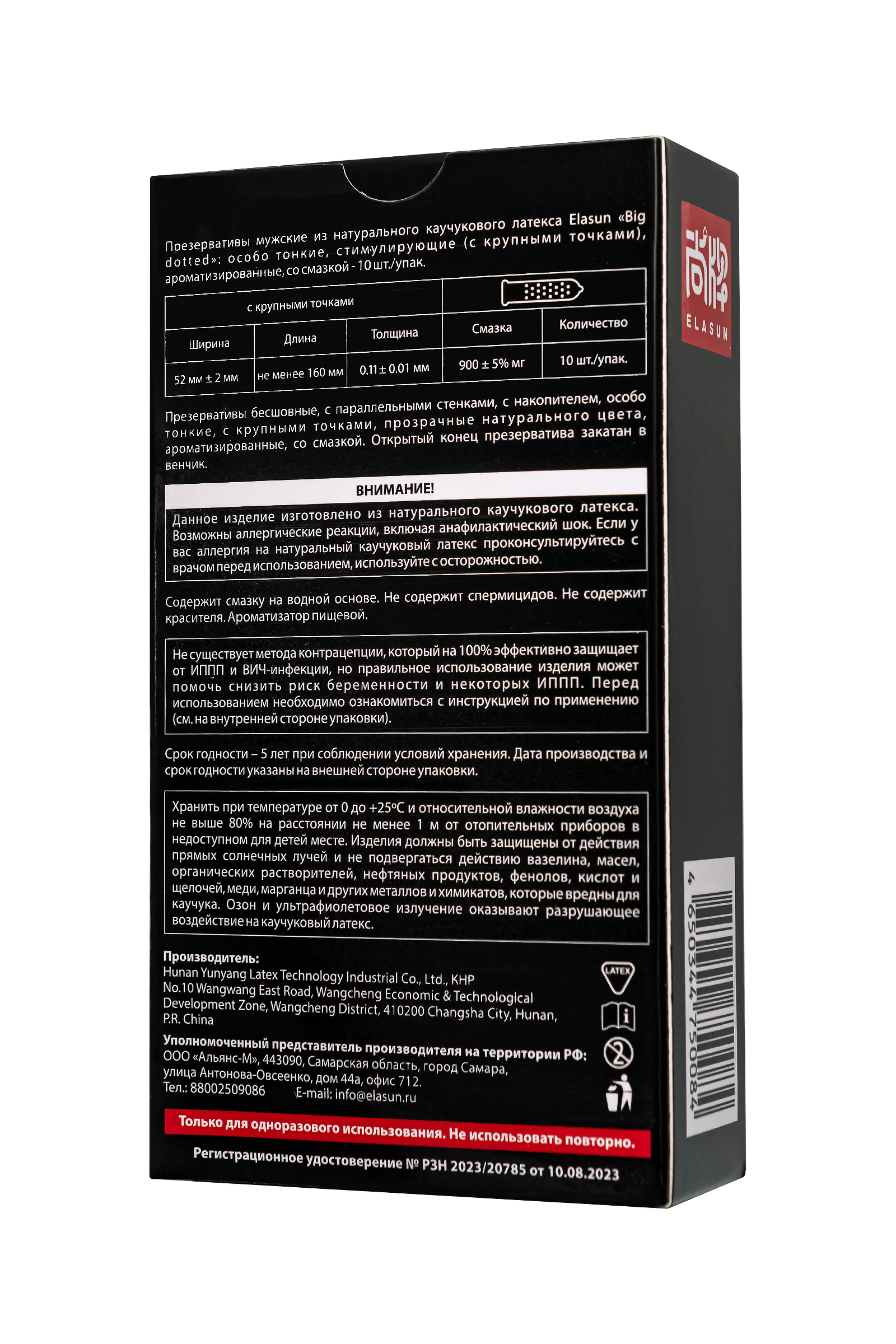 Изделие изготовлено из натурального латекса, бесшовное, с накопителем. Размеры: ширина 52 мм, длина не менее 160 мм, толщина 0,11 мм. Смазка содержит гиалуроновую кислоту для шелковистого комфорта. Специальный дизайн с крупными точками стимулирует точку G и повышает удовольствие. Упаковка черная с яркими графическими элементами, содержит информацию на русском и английском языках.