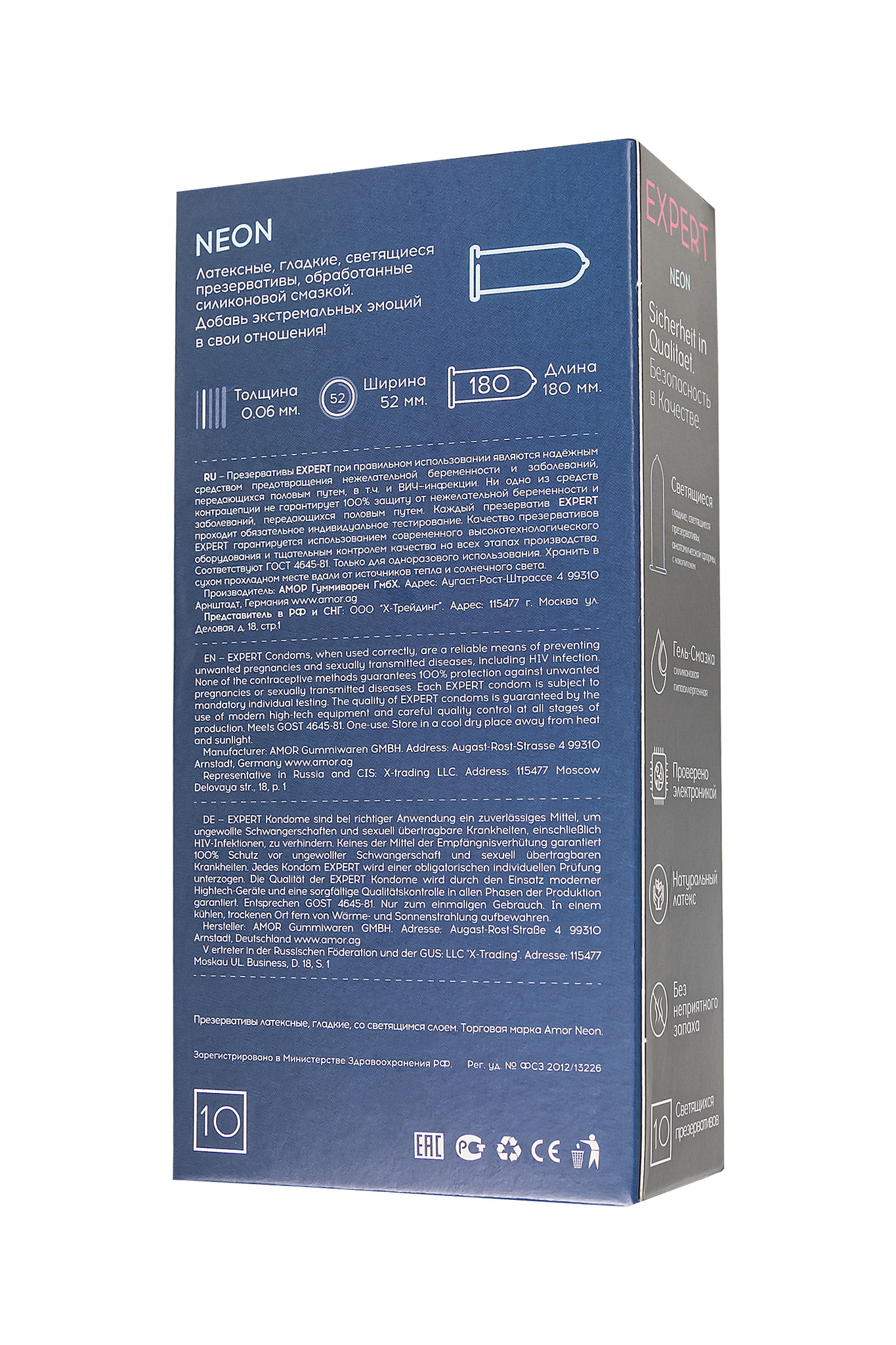 Презервативы Expert Neon светящиеся, 10 штук, длина 18см, диаметр 5.2см