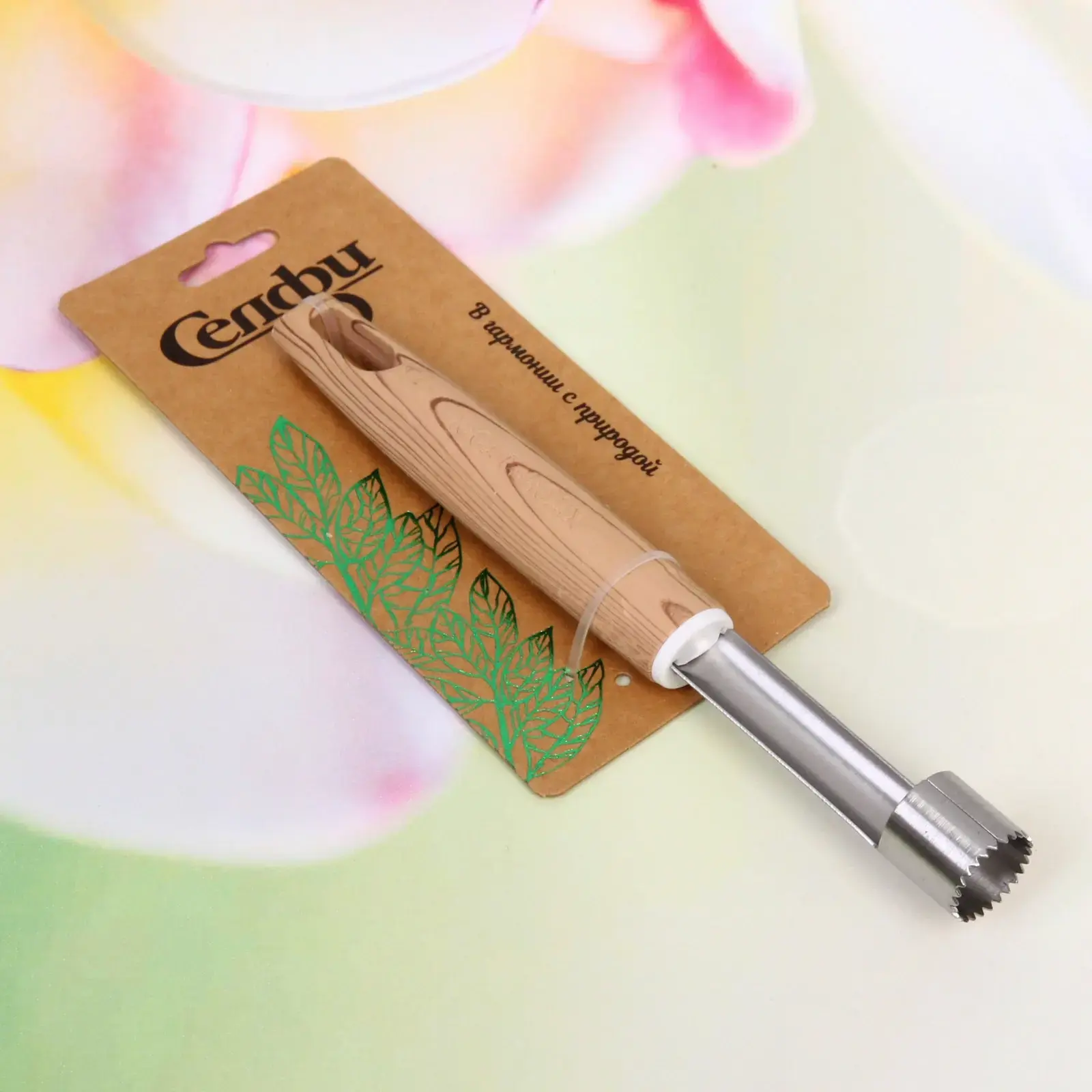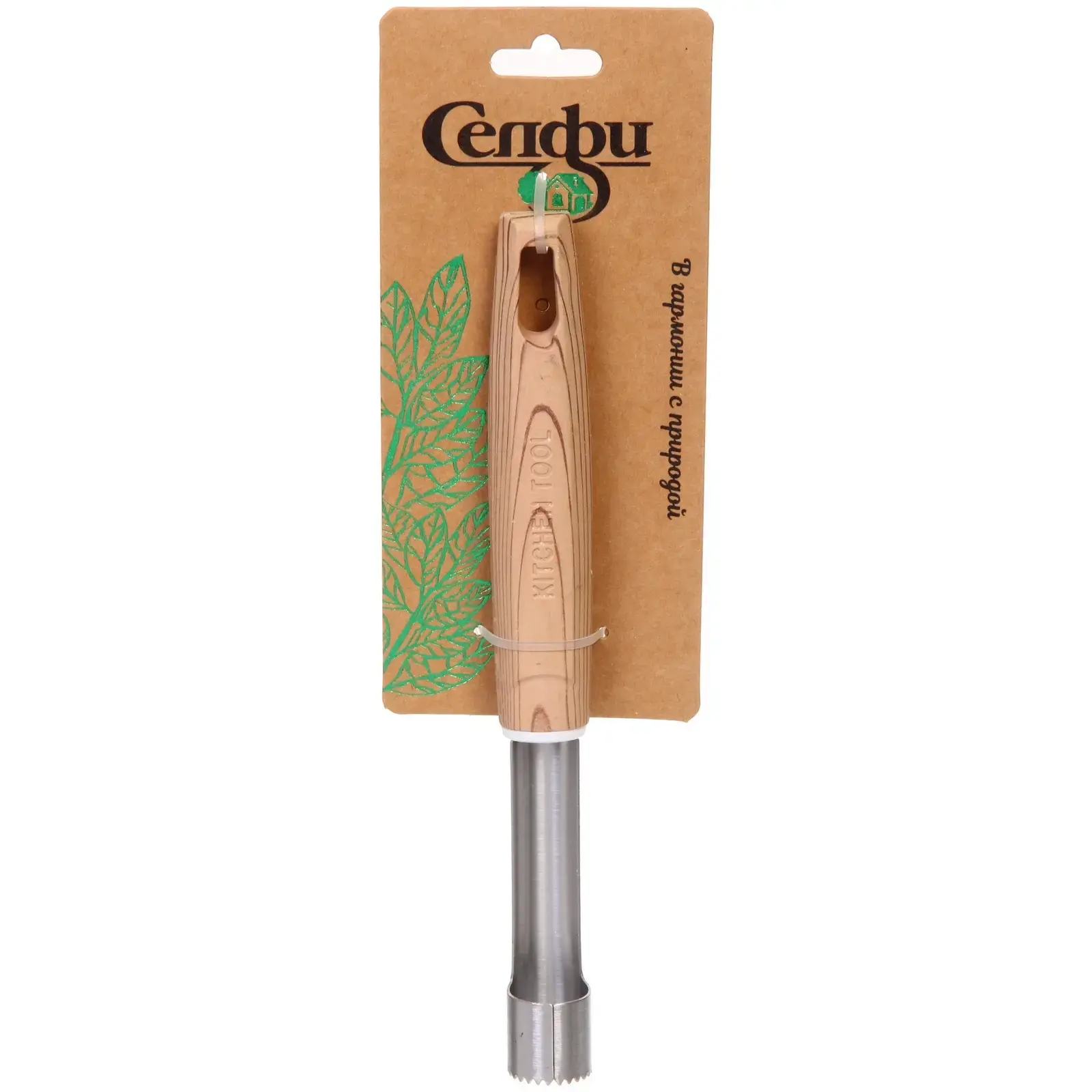 Прибор имеет стандартные размеры, что делает его удобным для работы. Металлическая часть с зубчатым краем обеспечивает легкость в использовании, а деревянная ручка придает ему стильный вид. Упаковка выполнена из картона с зеленым растительным дизайном, что подчеркивает экологичность продукта. «ECO LIFE» — это не просто инструмент, это ваш верный помощник в кулинарии!