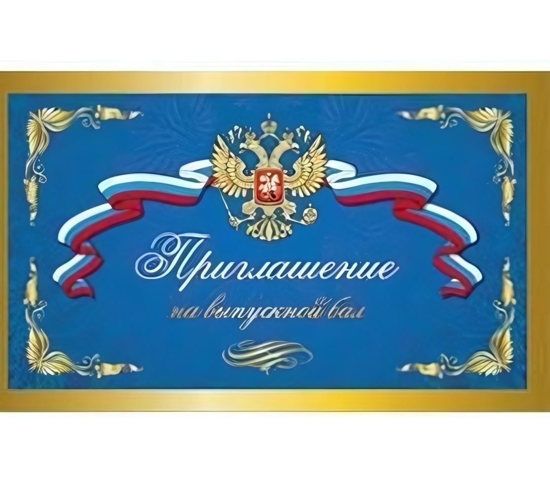 Приглашение на выпускной бал, сине-золотое, 15х10см, стильный дизайн с гербом