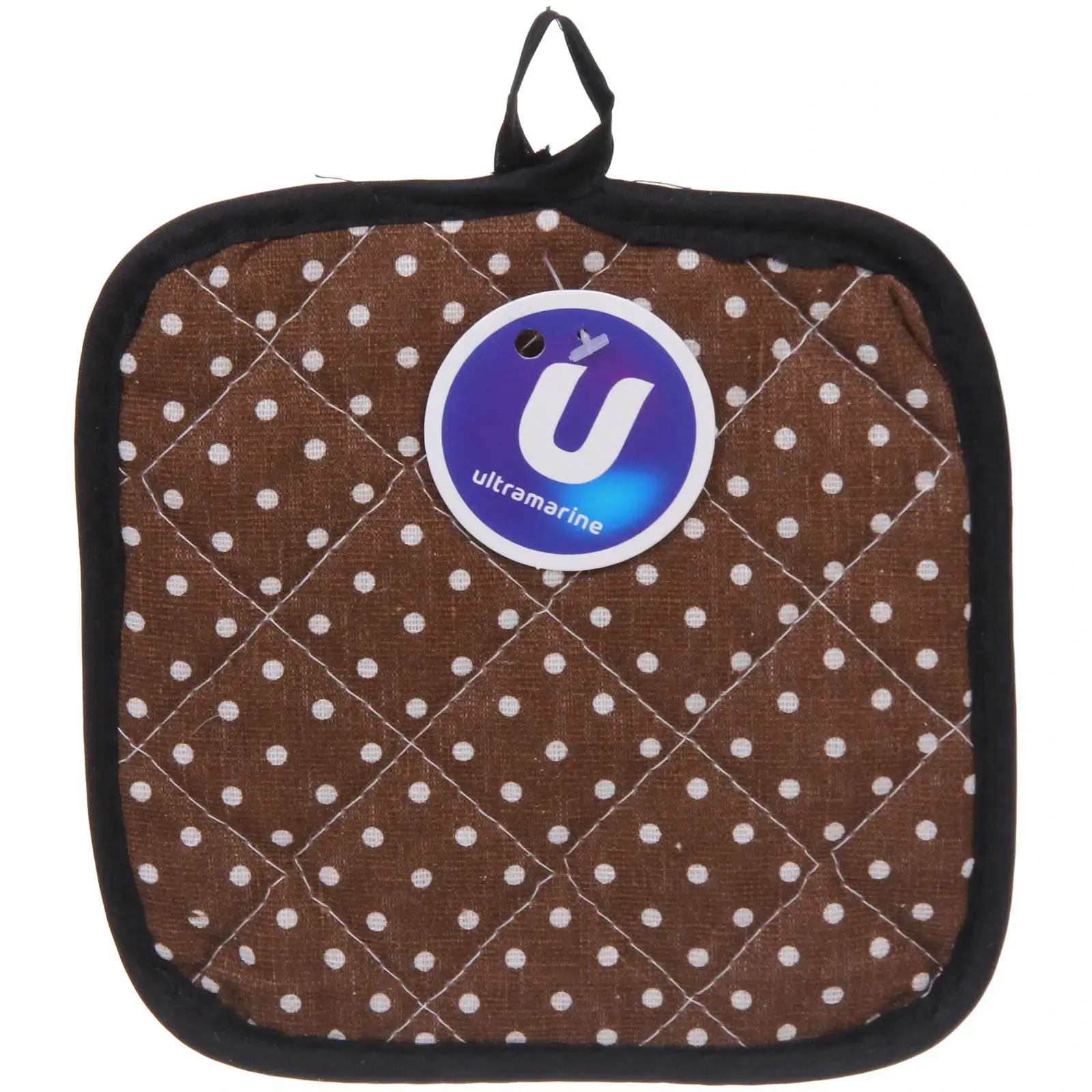 Эта прихватка станет незаменимым аксессуаром для каждой хозяйки, обеспечивая комфорт и безопасность при работе с горячими блюдами. Шоколадный цвет с белыми горошками добавляет стильный акцент в интерьер вашей кухни, а квадратная форма и удобная петелька для подвешивания делают её практичной в использовании.