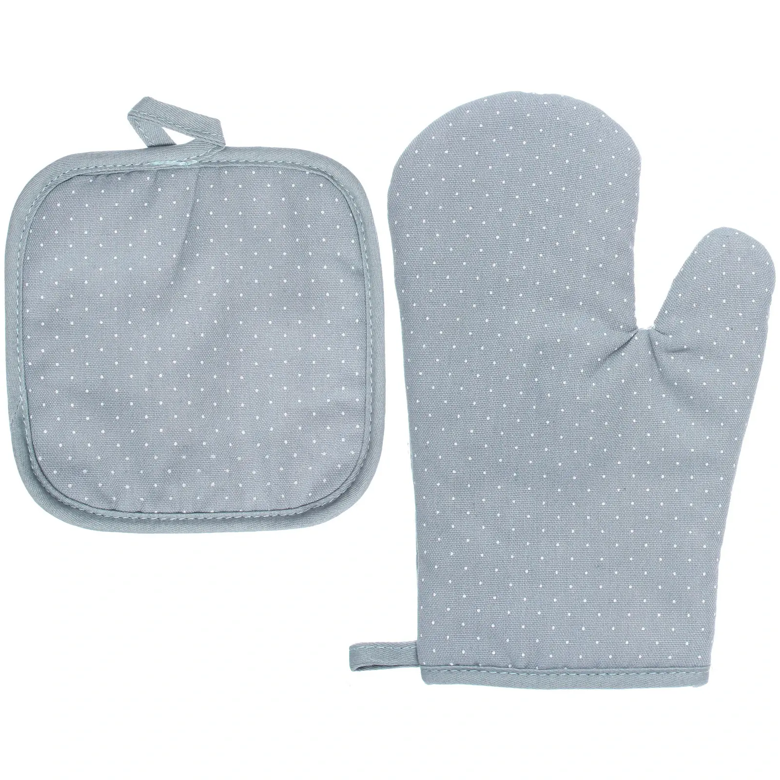 Размеры изделия — 25,5×17 см для прихватки и 17×17 см для варежки — обеспечивают удобство захвата и манипуляций с посудой. Благодаря стильному серому цвету с белым горошком они гармонично впишутся в любой интерьер кухни, а петли для подвешивания позволяют удобно хранить их рядом с рабочей зоной.