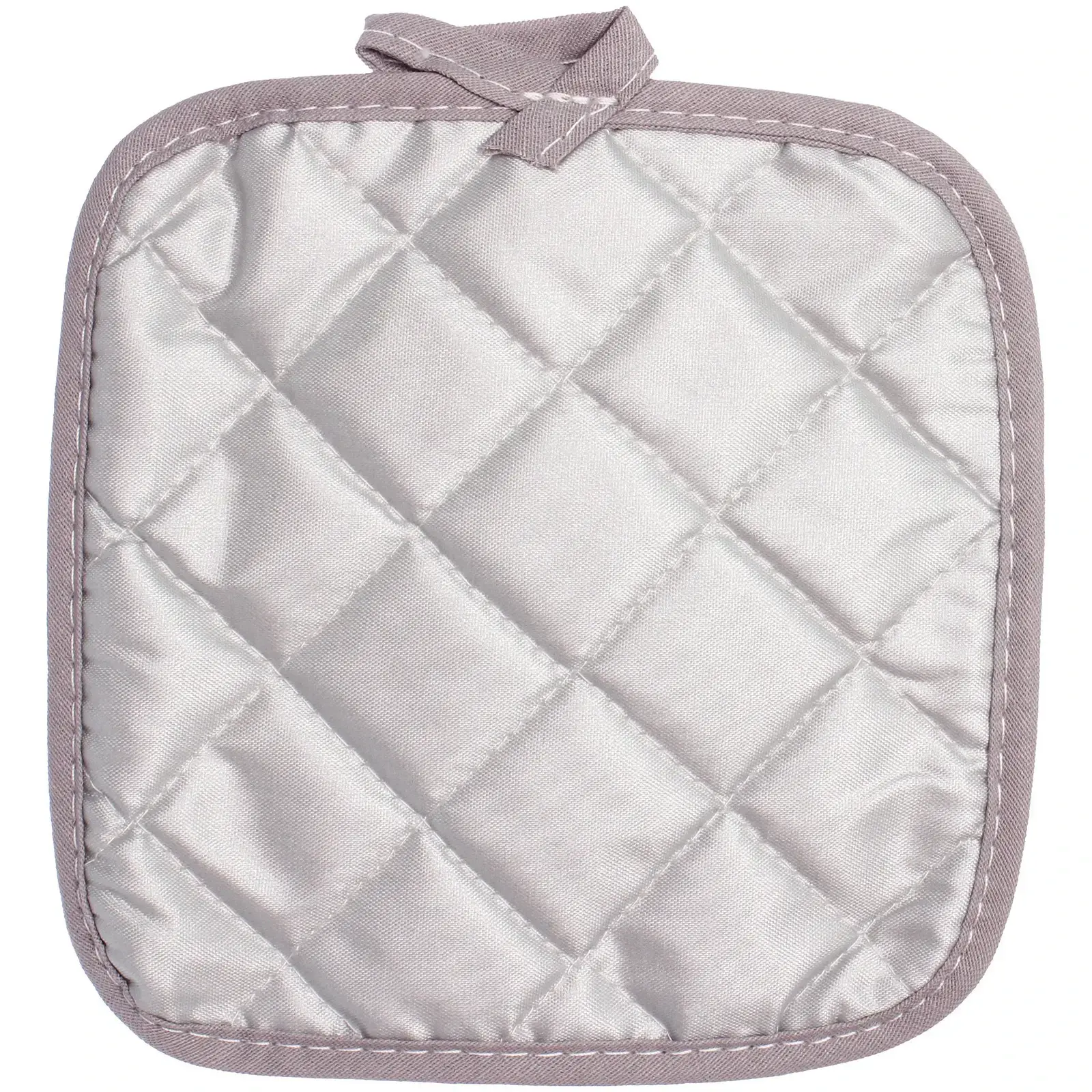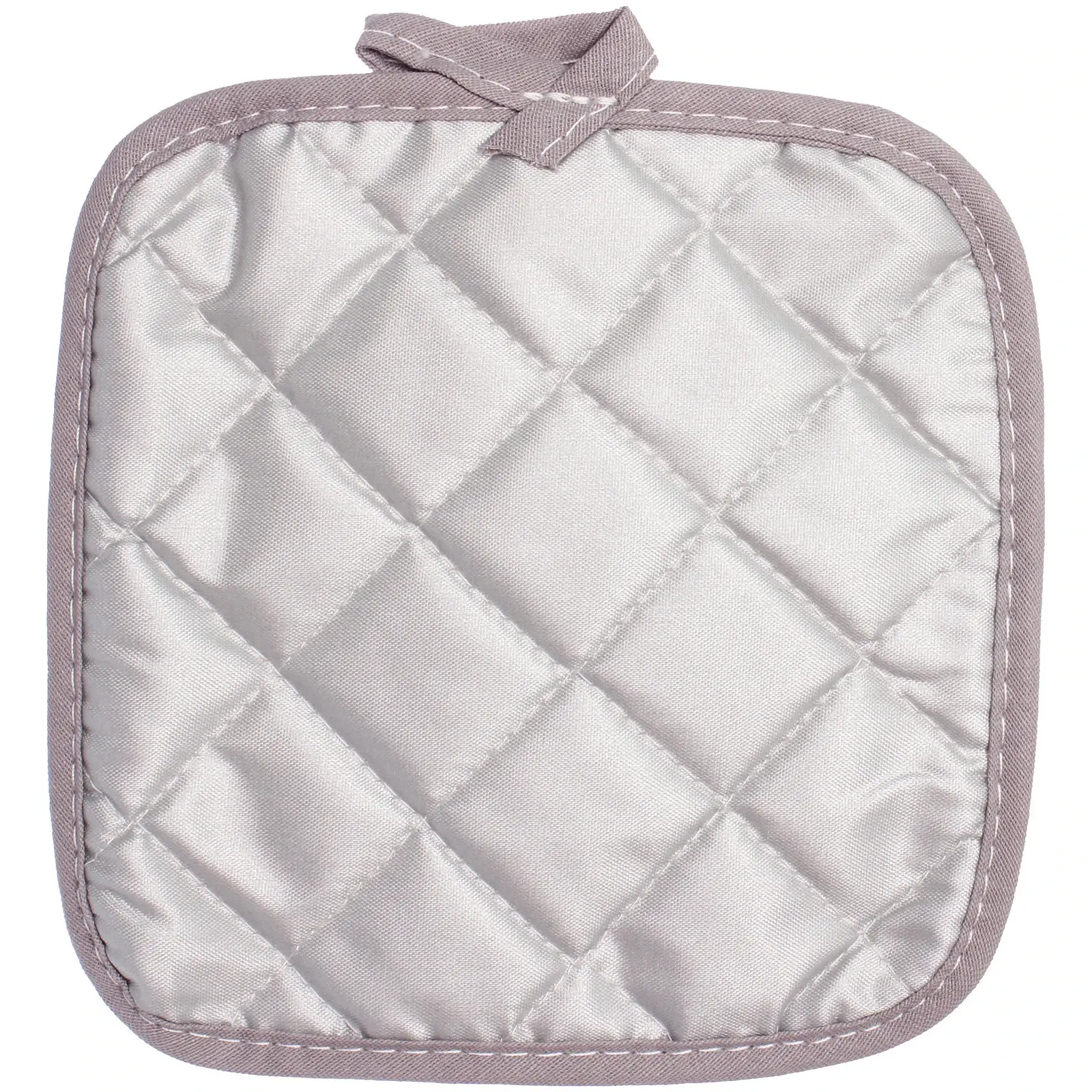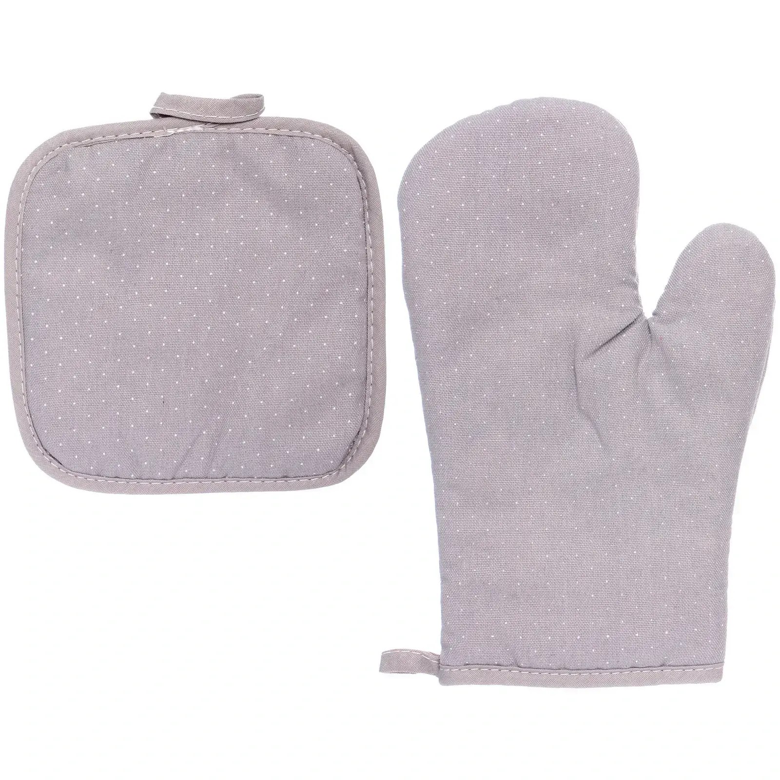 Размеры: квадратная прихватка — 25,5x17 см, варежка — 17x17 см, цвет — светло-серый с мелким точечным узором. Контрастная окантовка и декоративная строчка добавляют изделию стильности и практичности.
