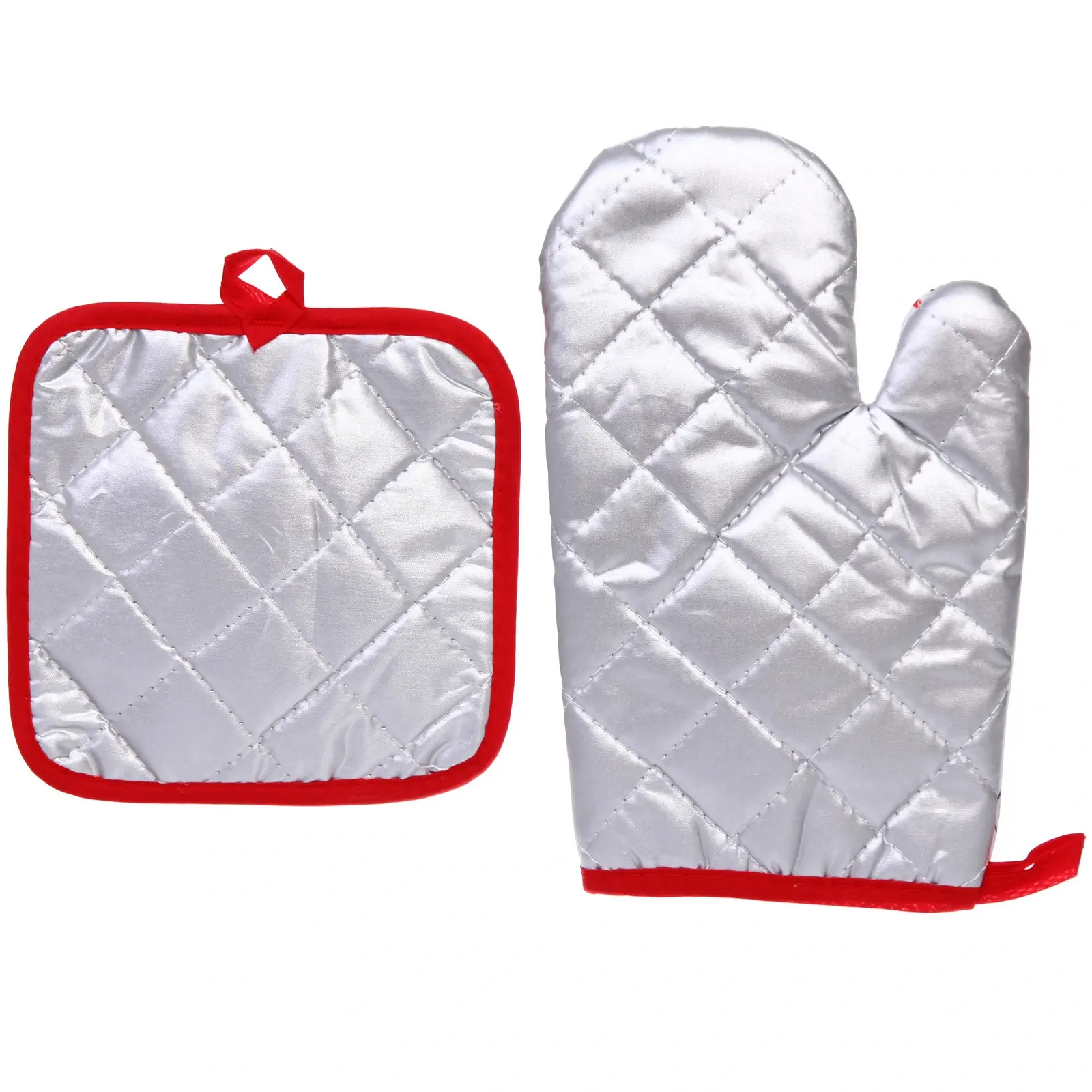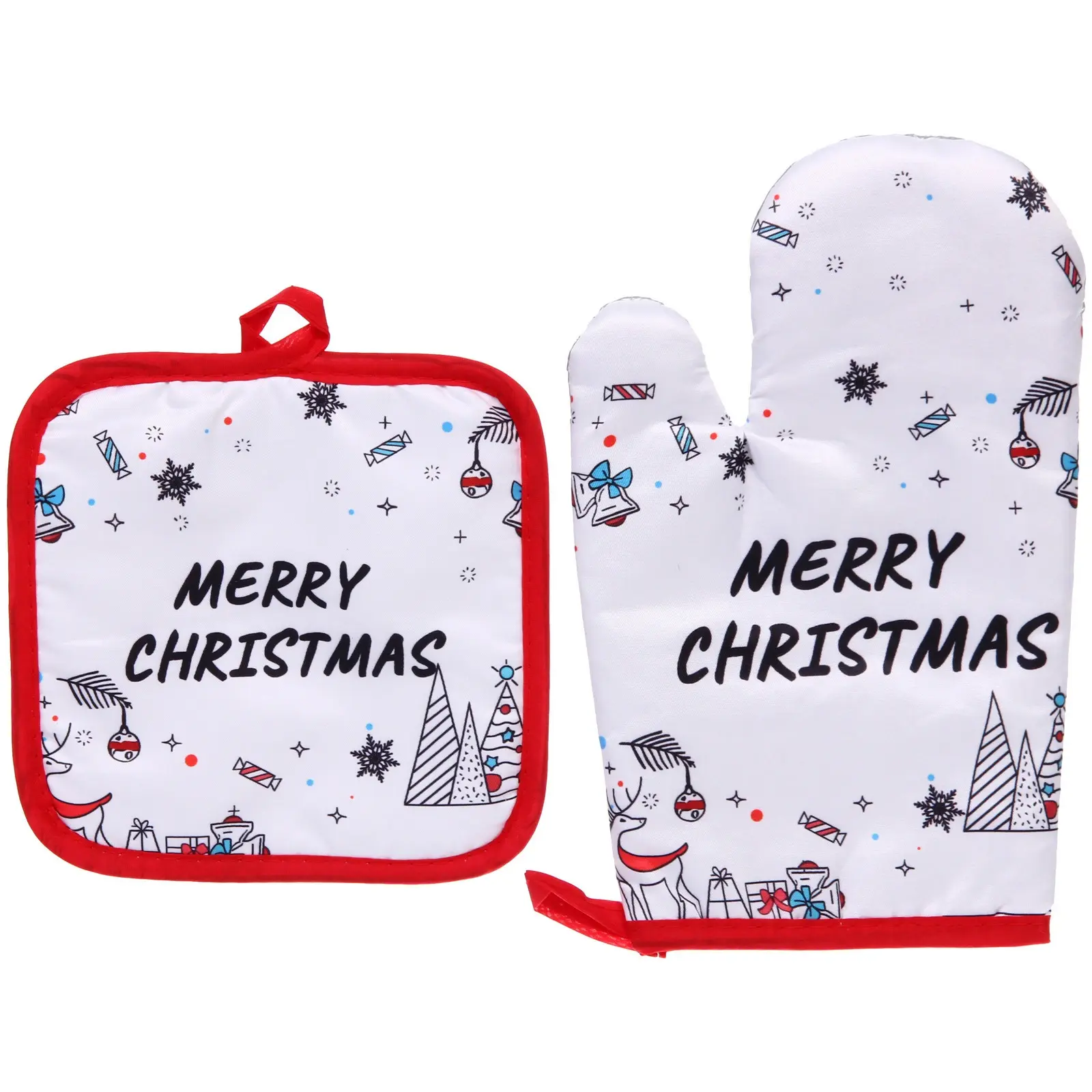 Комплект состоит из квадратной прихватки (25,5х16 см) с петлей для подвешивания и пятипалой варежки-можно использовать для защиты рук при работе с горячим посудой. Украшены праздничной отделкой с красной окантовкой и напечатанной надписью «MERRY CHRISTMAS», что делает их оригинальными и привлекательными.