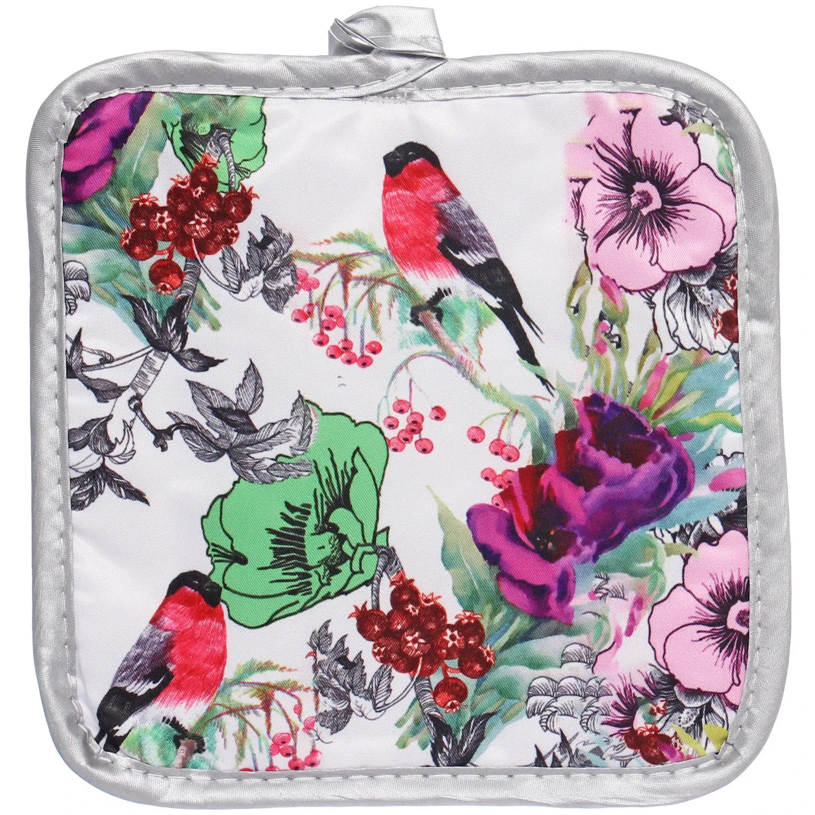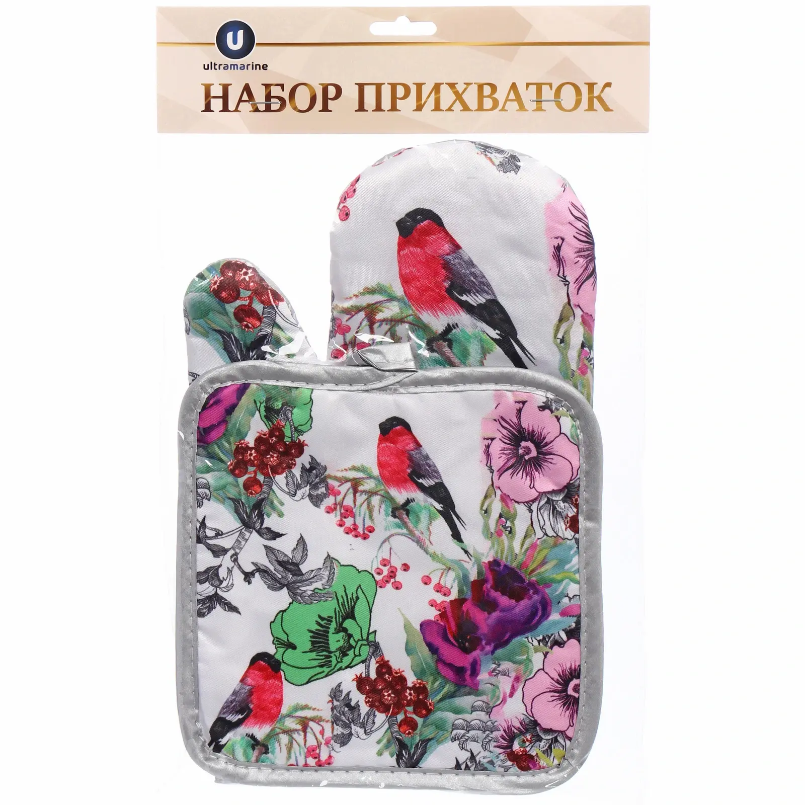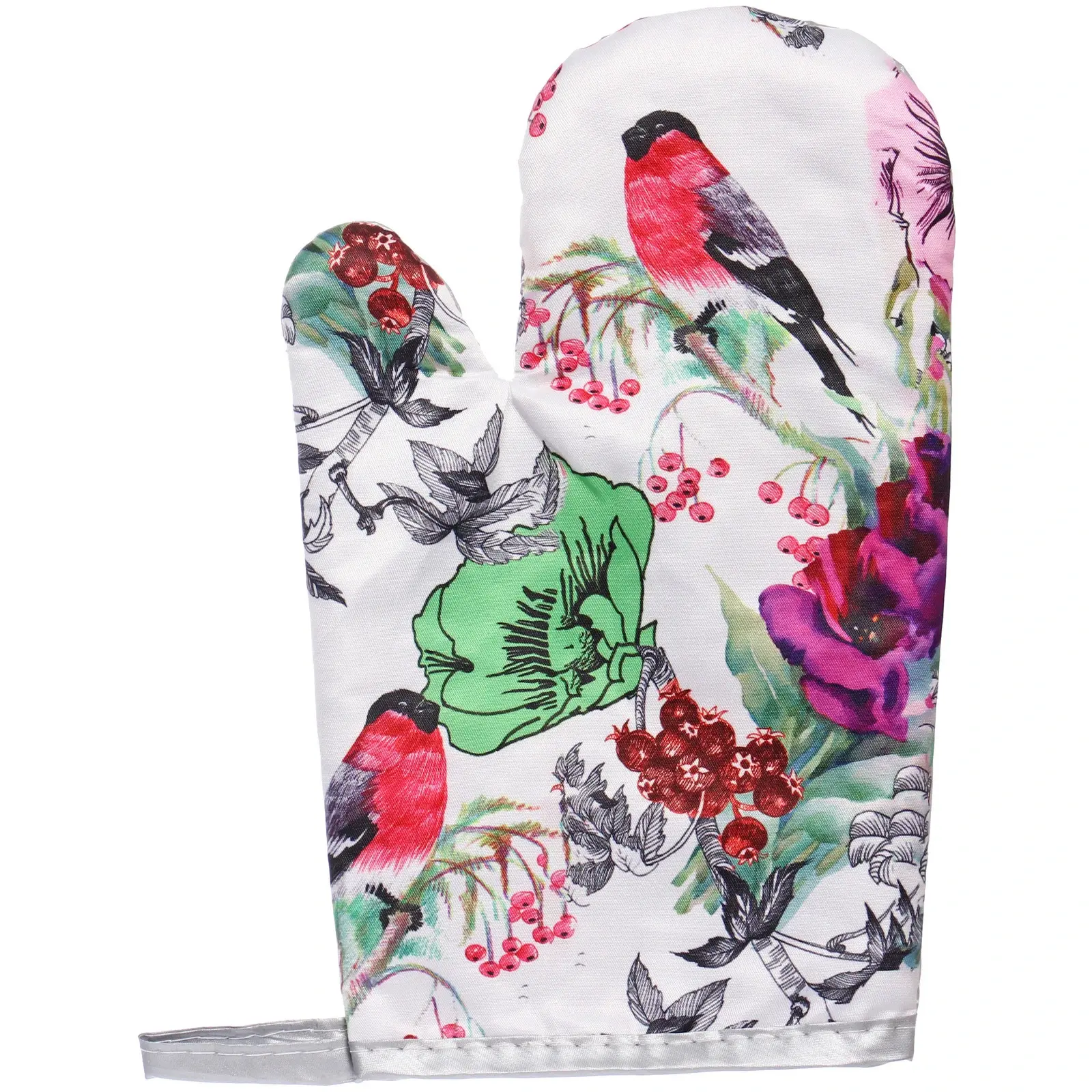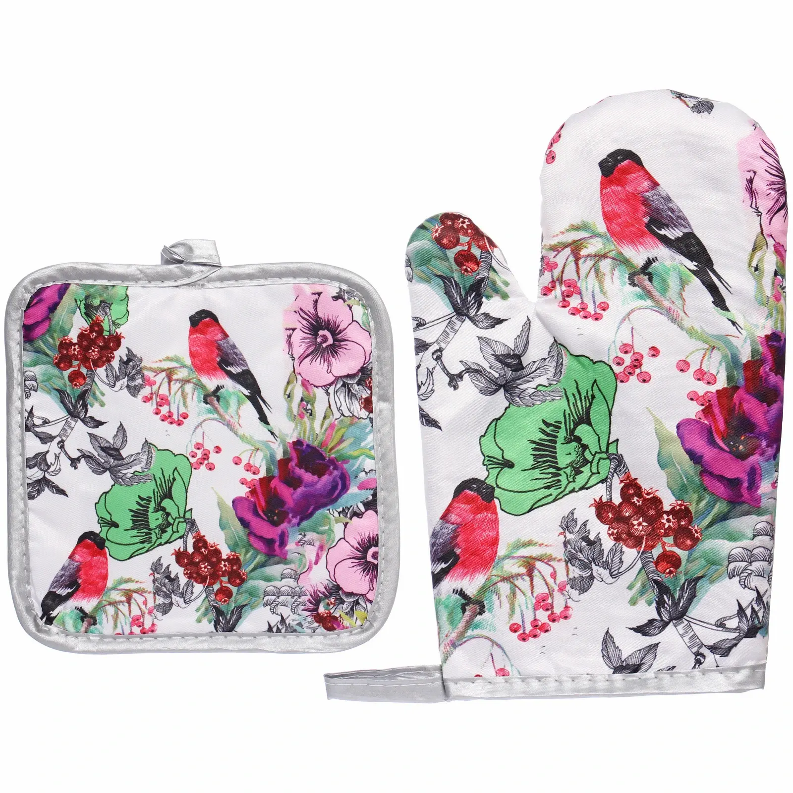 Преимущества: Размеры и форма подходят для защиты рук любой величины, принт с ярким растительным и птичьим мотивом делает их привлекательными для любителей стильных аксессуаров. Высокое качество ткани, прочные швы и защитное покрытие позволяют использовать их не только дома, но и на даче или в условиях профессиональной кухни.