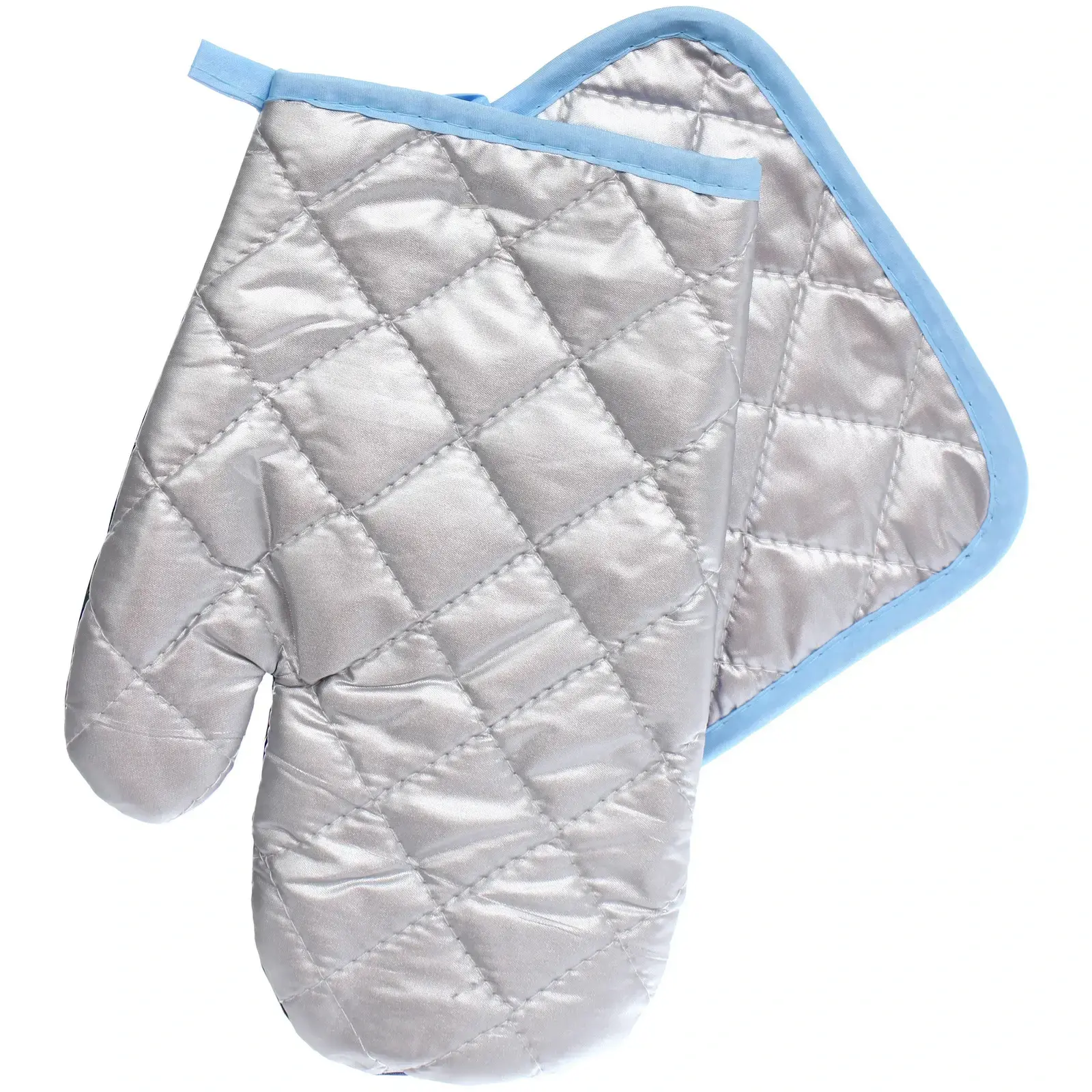 Изделия имеют оптимальные размеры: прихватка 17,5х17,5 см и варежка 26х17 см. Голубая окантовка не только украшает изделия, но и защищает края от быстрого износа.