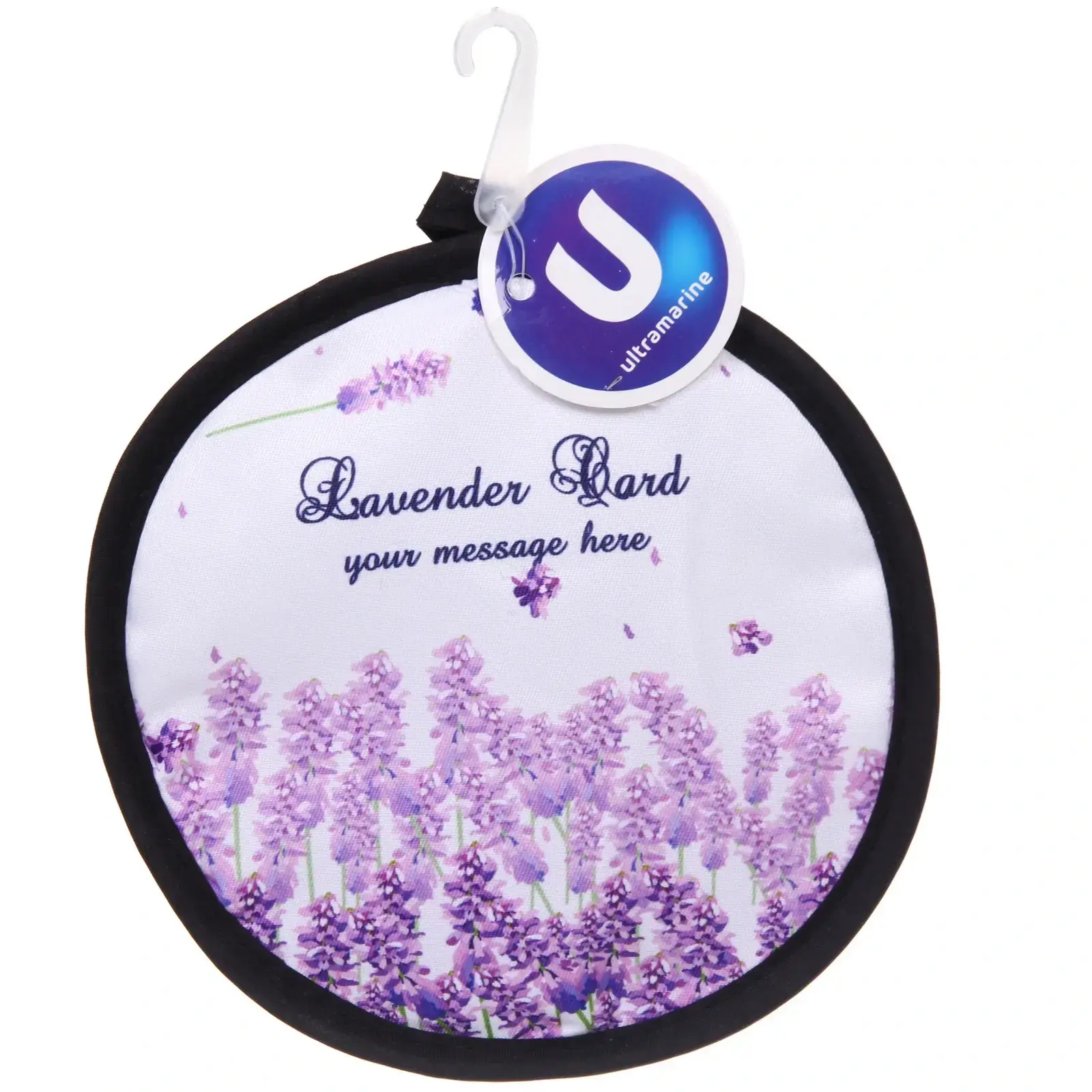 Прихватка выполнена из полиэстера, что гарантирует её жаростойкость и легкость в уходе. Белый фон с фиолетовыми цветами лаванды и черной окантовкой делает её универсальной для любого интерьера. Размеры и точные характеристики не указаны, но форма варежки обеспечивает удобство в использовании.