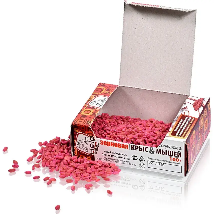 Объем: 100 г. Упаковка: картонная прямоугольная коробка. Страна происхождения: Россия. Используется для уничтожения грызунов в бытовых и хозяйственных помещениях.