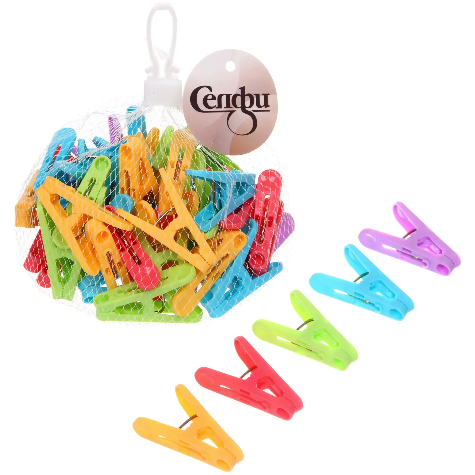 Пластиковый корпус устойчив к влаге и перепадам температур — прищепки не деформируются со временем. Яркая палитра из 5 цветов (красный, синий, зеленый, желтый, фиолетовый) превращает рутину в удовольствие, а прозрачная сетка с подвесом экономит место в кладовой.