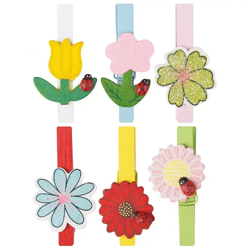 Прищепки декоративные с цветами и божьими коровками, деревянные, комплект из 6 шт, цвета микс