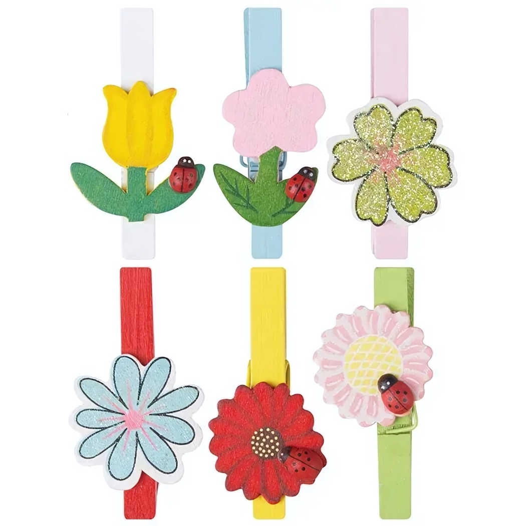 Набор из 6 декоративных прищепок с цветочным дизайном и изображением божьих коровок добавит красок вашему интерьеру. Идеально подходит для крепления фотографий, заметок, создания праздничного декора или оригинальных поделок.