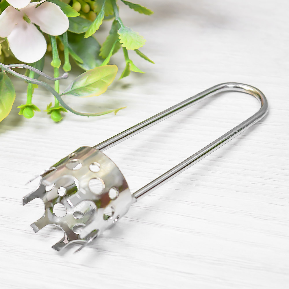 Длина приспособления составляет 12 см, что делает его компактным и удобным для хранения. Металлическая конструкция обеспечивает надежность и долговечность, а блестящая поверхность придает ему стильный вид. Это приспособление станет отличным дополнением к вашим кухонным принадлежностям и поможет вам готовить с удовольствием.