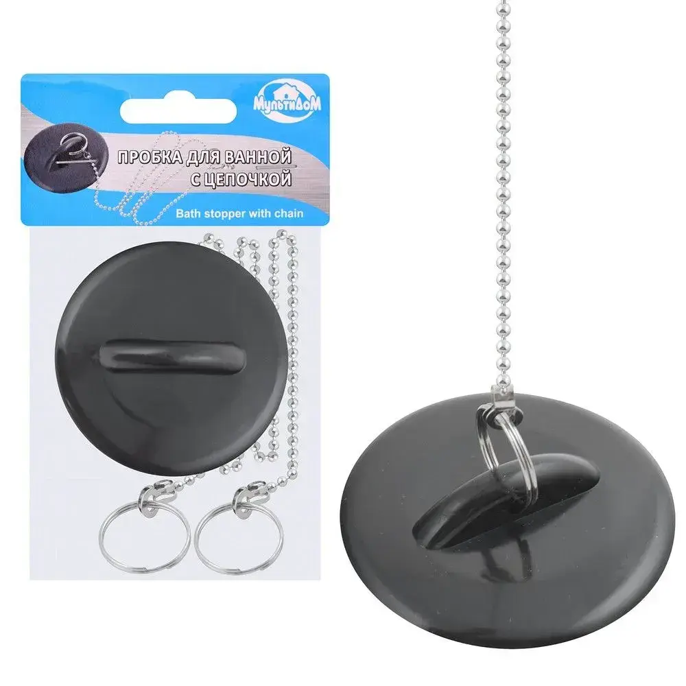 Пробка для ванной с цепочкой, пластик/металл, черная, фиксатор от потери, диаметр 7.5 см