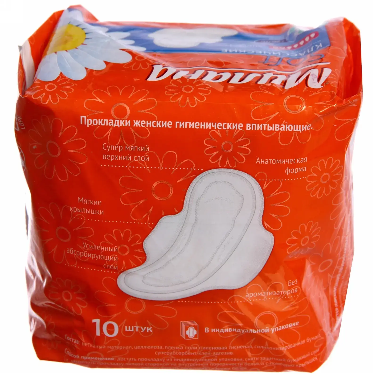 В упаковке содержится 10 штук прокладок, что обеспечивает длительное использование. Материалы, из которых изготовлены прокладки, включают целлюлозу и полипропилен, что обеспечивает их прочность и эффективность. Прокладки имеют ярко-оранжевую упаковку с цветочным дизайном, что делает их привлекательными и легко узнаваемыми на полке.