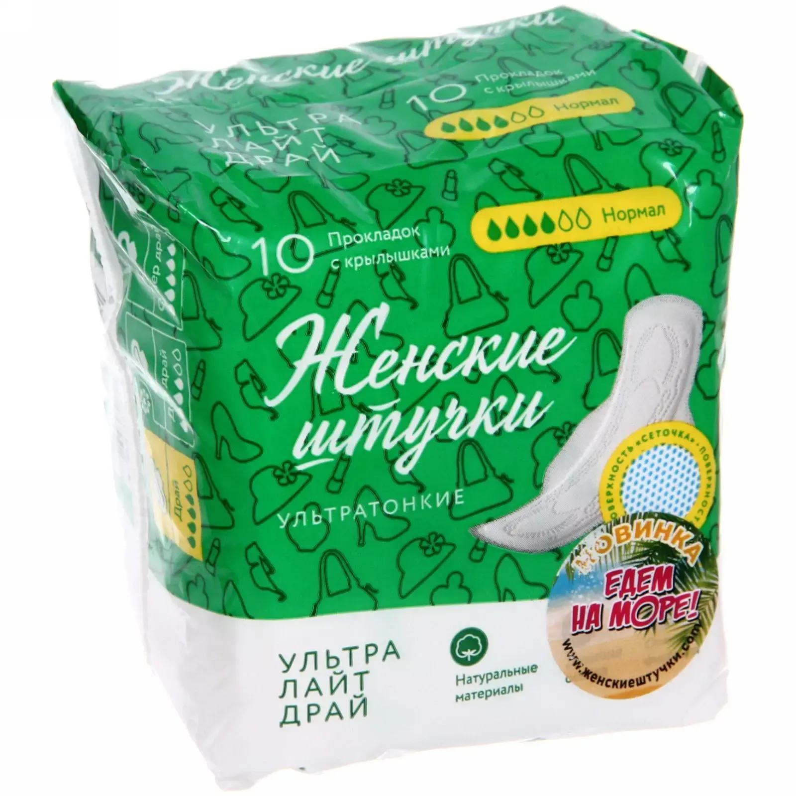 В упаковке содержится 10 штук прокладок, каждая из которых обладает уникальными свойствами. Они имеют зеленый цвет упаковки с яркими надписями и символами, указывающими на уровень впитываемости. Прокладки 'Женские штучки' — это ваш надежный помощник в заботе о женском здоровье.