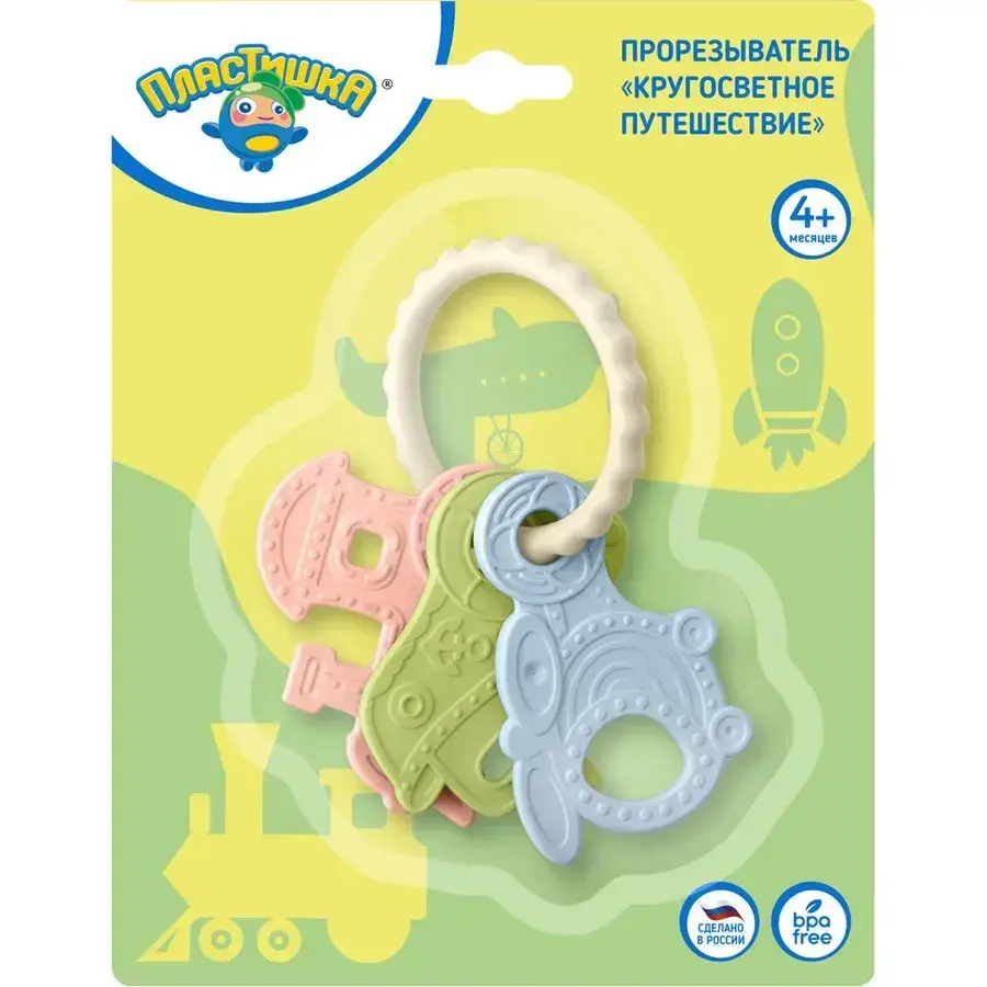 Силиконовый прорезыватель 'Кругосветное путешествие' создан для комфортного массажа десен вашего малыша. Игровые формы транспортных средств (паровоз, самолет, ракета) развлекают ребенка и отвлекают от дискомфорта.