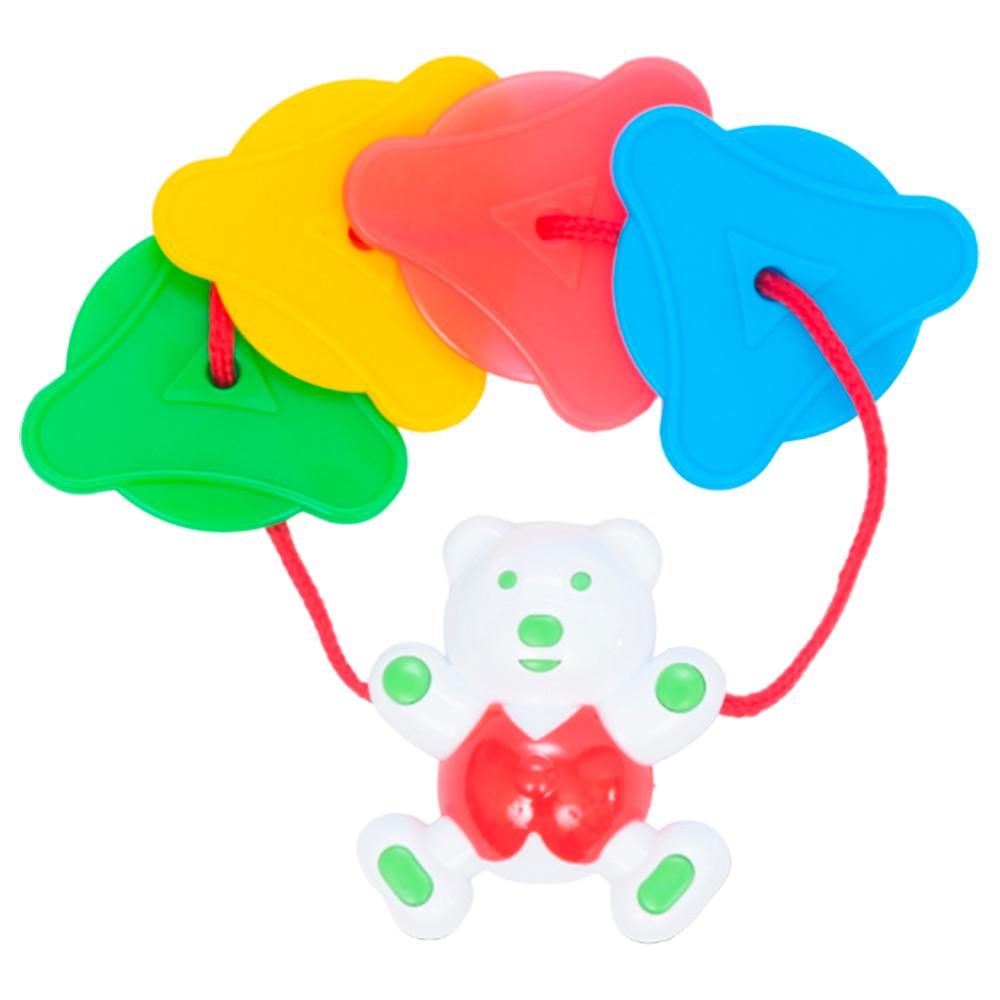 Игрушка состоит из фигурки белого медведя и нескольких разноцветных элементов, соединенных прочным красным шнурком. Такая конструкция делает прорезыватель интересным для изучения, а неоднородная поверхность элементов эффективно справляется с задачей снятия напряжения с десен. Компактный размер изделия позволяет брать его с собой на прогулку, в гости или в путешествие.