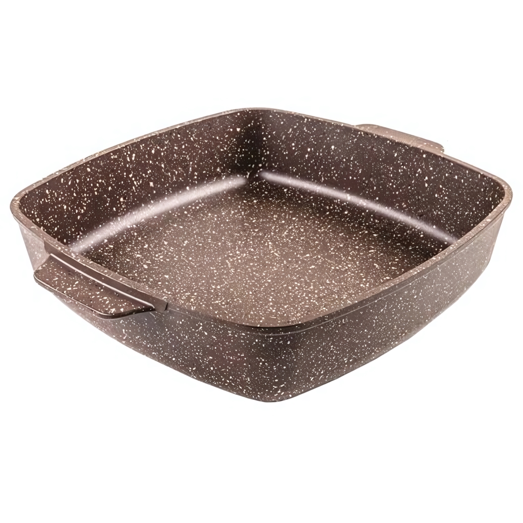 - Презентабельный внешний вид: Стильный коричневый цвет с крапинками ("шоколад") сохраняет свой вид даже после множества циклов приготовления. Противень выглядит аккуратно и может быть подан на стол прямо из духовки.